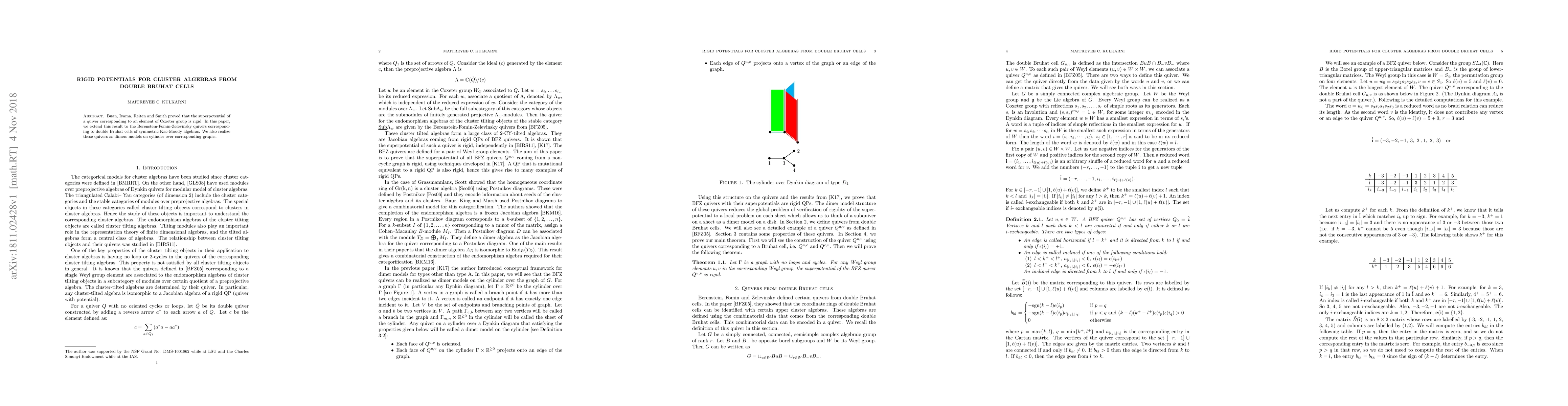 This paper extends the rigidity of superpotentials from Coxeter groups to Berenstein-Fomin-Zelevinsky quivers associated with double Bruhat cells of symmetric Kac-Moody algebras, and presents these quivers as dimer models on cylinders over corresponding graphs.