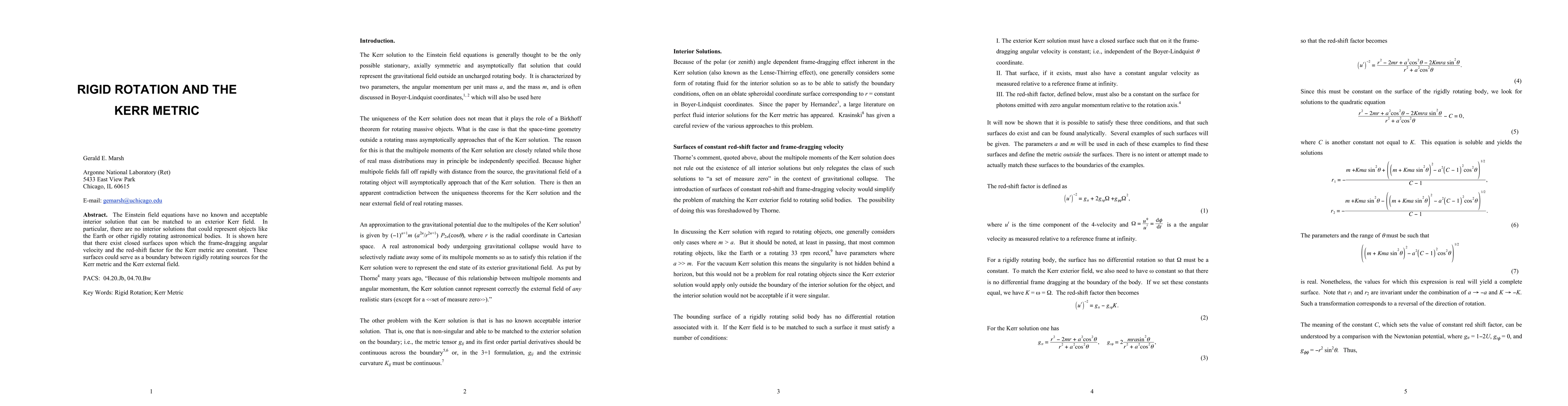 This paper discusses the absence of acceptable interior solutions to the Einstein field equations that match the Kerr metric for exterior rotation, highlighting the lack of solutions for rigidly rotating bodies like Earth. It proposes closed surfaces where the frame-dragging angular velocity and red-shift factor are constant, potentially demarcating boundaries between rotating sources and the Kerr external field.