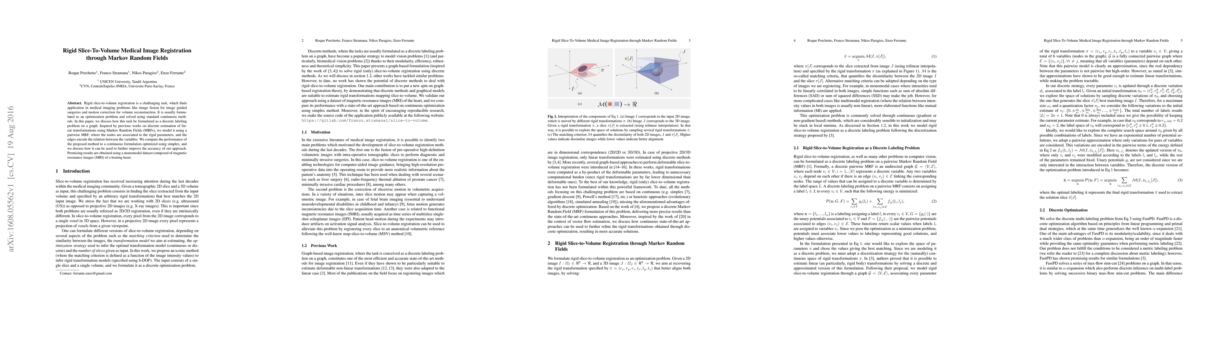 This paper proposes a discrete labeling approach using Markov Random Fields (MRFs) to tackle rigid slice-to-volume registration in medical imaging, comparing its performance to a continuous optimization method. Initial results on MRI data show promising improvements in accuracy.