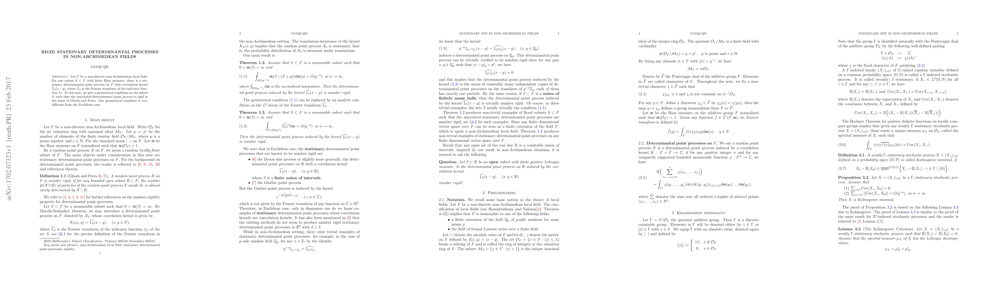 This paper explores stationary determinantal point processes on non-Archimedean local fields, proving the existence of such processes for subsets with finite Haar measure. It introduces a geometrical condition ensuring the rigidity of these processes, which differs significantly from conditions in the Euclidean case.
