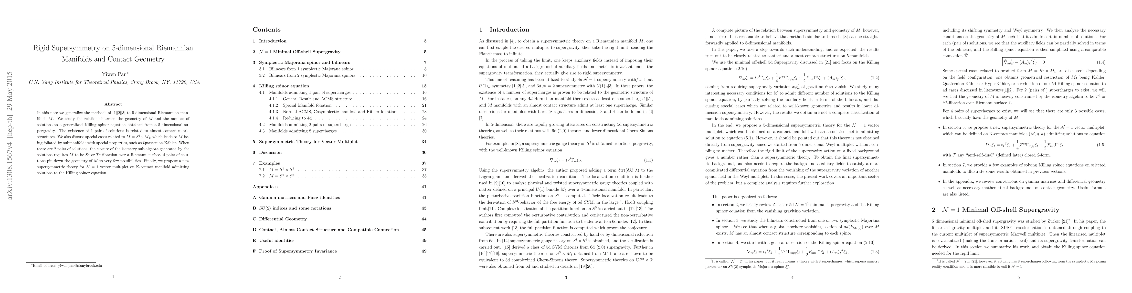 In this note we generalize the methods of [1][2][3] to 5-dimensional Riemannian manifolds M. We study the relations between the geometry of M and the number of solutions to a generalized Killing spinor equation obtained from a 5-dimensional supergravity. The existence of 1 pair of solutions is related to almost contact metric structures. We also discuss special cases related to $M = S1 \times M4$, which leads to M being foliated by submanifolds with special properties, such as Quaternion-Kahler. When there are 2 pairs of solutions, the closure of the isometry sub-algebra generated by the solutions requires M to be S3 or T3-fibration over a Riemann surface. 4 pairs of solutions pin down the geometry of M to very few possibilities. Finally, we propose a new supersymmetric theory for N = 1 vector multiplet on K-contact manifold admitting solutions to the Killing spinor equation.