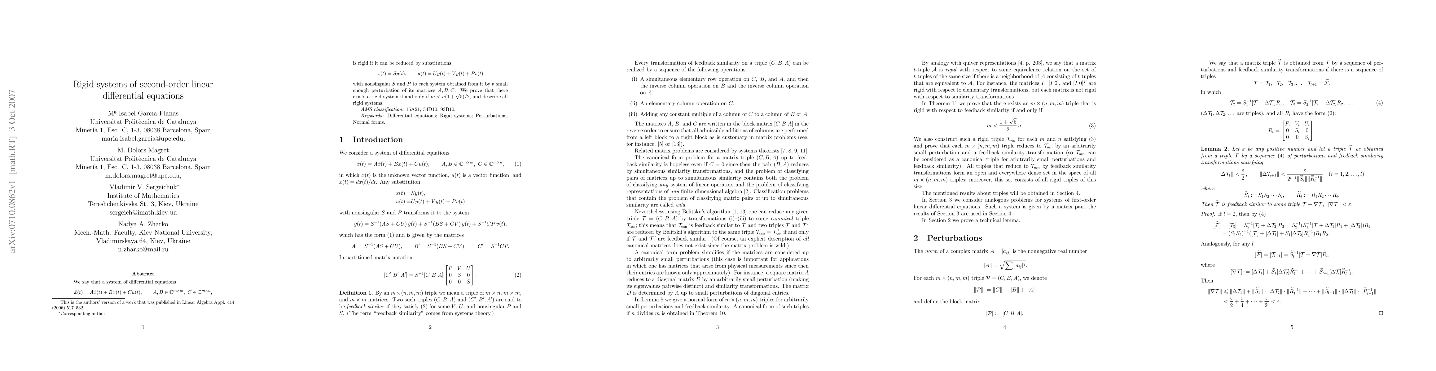 A system of second-order linear differential equations is rigid if it can be transformed into another system through a small perturbation of its matrices, under certain conditions (m < n*(1+sqrt(5))/2). The paper proves the existence and describes all rigid systems.