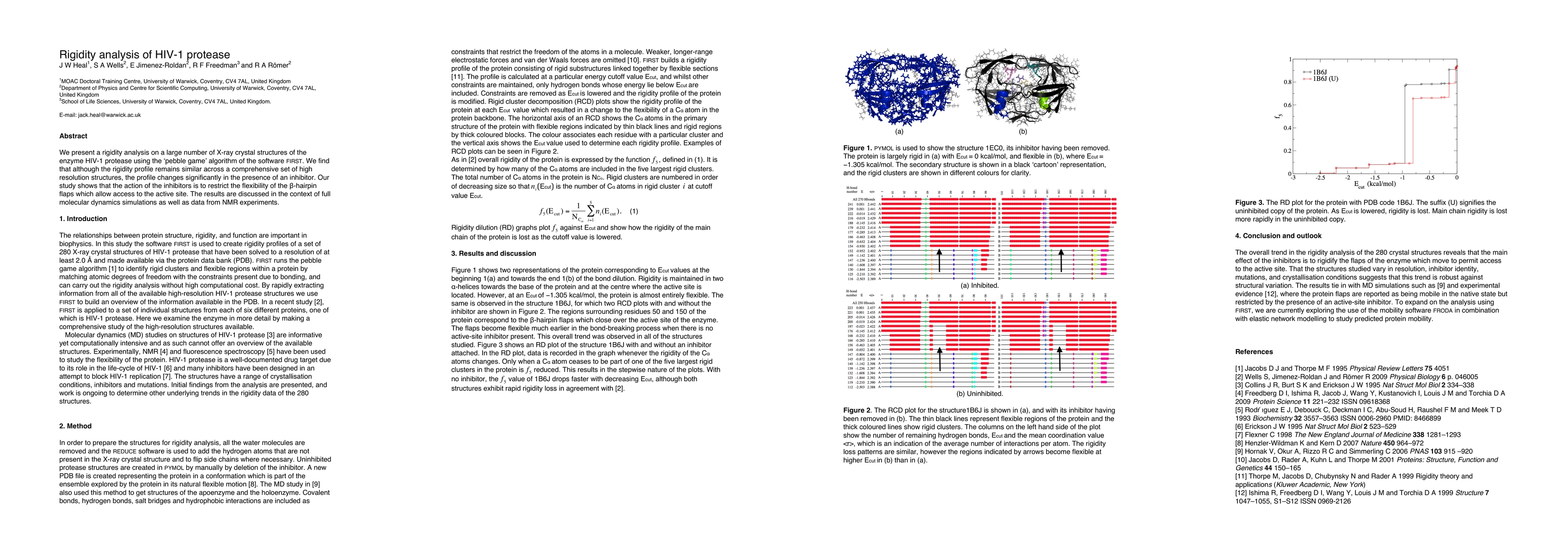 We present a rigidity analysis on a large number of X-ray crystal structures of the enzyme HIV-1 protease using the 'pebble game' algorithm of the software FIRST. We find that although the rigidity profile remains similar across a comprehensive set of high resolution structures, the profile changes significantly in the presence of an inhibitor. Our study shows that the action of the inhibitors is to restrict the flexibility of the beta-hairpin flaps which allow access to the active site. The results are discussed in the context of full molecular dynamics simulations as well as data from NMR experiments.