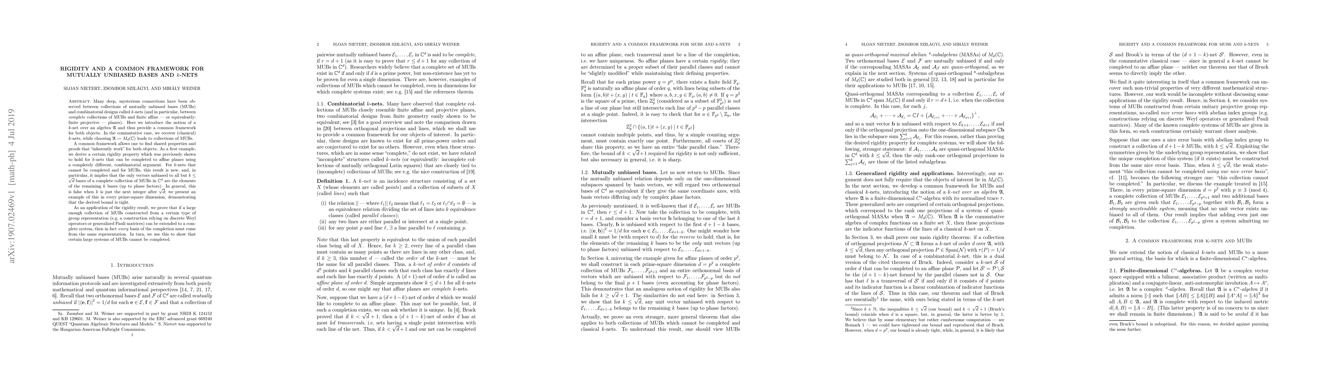 Many deep, mysterious connections have been observed between collections of mutually unbiased bases (MUBs) and combinatorial designs called $k$-nets (and in particular, between complete collections of MUBs and finite affine - or equivalently: finite projective - planes). Here we introduce the notion of a $k$-net over an algebra $\mathfrak{A}$ and thus provide a common framework for both objects. In the commutative case, we recover (classical) $k$-nets, while choosing $\mathfrak{A} := M_d(\mathbb C)$ leads to collections of MUBs. A common framework allows one to find shared properties and proofs that "inherently work" for both objects. As a first example, we derive a certain rigidity property which was previously shown to hold for $k$-nets that can be completed to affine planes using a completely different, combinatorial argument. For $k$-nets that cannot be completed and for MUBs, this result is new, and, in particular, it implies that the only vectors unbiased to all but $k \leq \sqrt{d}$ bases of a complete collection of MUBs in $\mathbb C^d$ are the elements of the remaining $k$ bases (up to phase factors). In general, this is false when $k$ is just the next integer after $\sqrt{d}$; we present an example of this in every prime-square dimension, demonstrating that the derived bound is tight. As an application of the rigidity result, we prove that if a large enough collection of MUBs constructed from a certain type of group representation (e.g. a construction relying on discrete Weyl operators or generalized Pauli matrices) can be extended to a complete system, then in fact every basis of the completion must come from the same representation. In turn, we use this to show that certain large systems of MUBs cannot be completed.