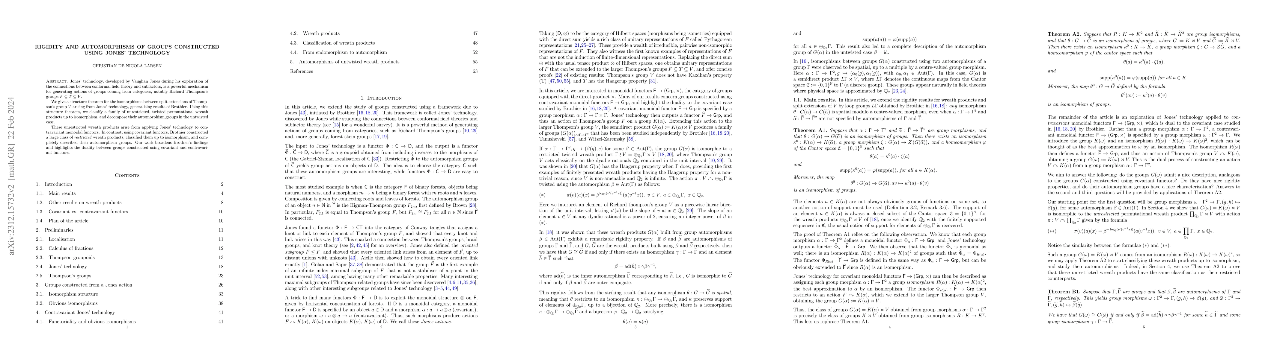 Jones' technology, developed by Vaughan Jones during his exploration of the connections between conformal field theory and subfactors, is a powerful mechanism for generating actions of groups coming from categories, notably Richard Thompson's groups $F \subseteq T \subseteq V$. We give a structure theorem for the isomorphisms between split extensions of Thompson's group $V$ arising from Jones' technology, generalising results of Brothier. Using this structure theorem, we classify a family of unrestricted, twisted permutational wreath products up to isomorphism, and decompose their automorphism groups in the untwisted case. These unrestricted wreath products arise from applying Jones' technology to contravariant monoidal functors. In contrast, using covariant functors, Brothier constructed a large class of restricted wreath products, classified them up to isomorphism, and completely described their automorphism groups. Our work broadens Brothier's findings and highlights the duality between groups constructed using covariant and contravariant functors.