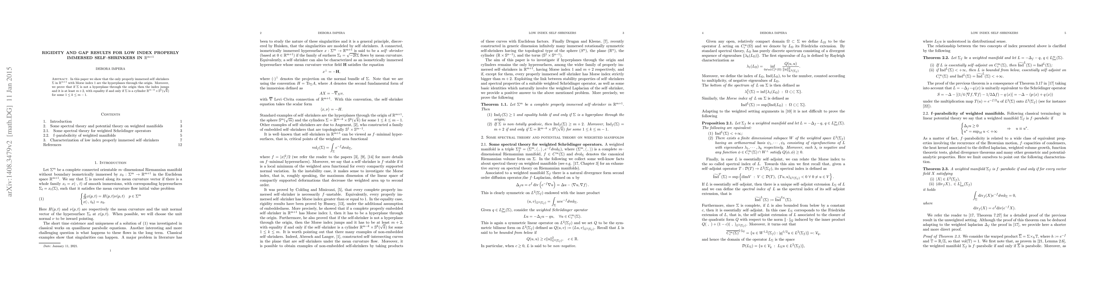 In this paper we show that the only properly immersed self--shrinkers $\Sigma$ in $\mathbb{R}^{m+1}$ with Morse index $1$ are the hyperplanes through the origin. Moreover, we prove that if $\Sigma$ is not a hyperplane through the origin then the index jumps and it is at least $m+2$, with equality if and only if $\Sigma$ is a cylinder $\mathbb{R}^{m-k}\times \mathbb{S}^{k}(\sqrt{k})$ for some $1\leq k\leq m-1$.