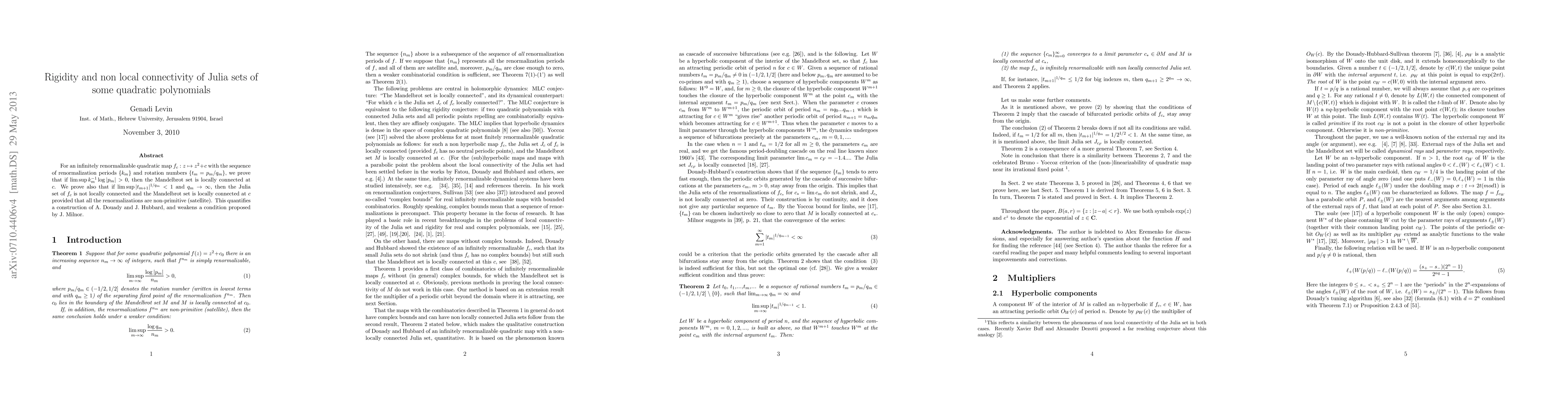 Researchers study the connectivity of Julia sets for certain quadratic polynomials, finding that local connectedness depends on specific conditions related to renormalization periods and rotation numbers.
