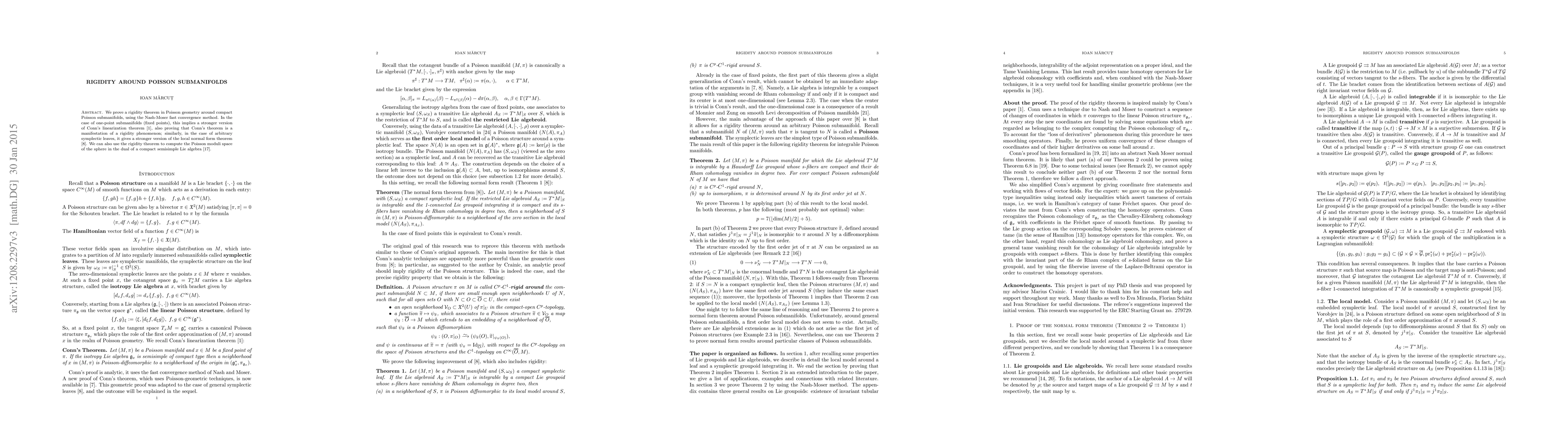 This paper establishes a rigidity theorem for compact Poisson submanifolds employing the Nash-Moser method, which extends Conn's linearization theorem and local normal form theorem for symplectic leaves, and computes the Poisson moduli space for spheres in duals of compact semisimple Lie algebras.
