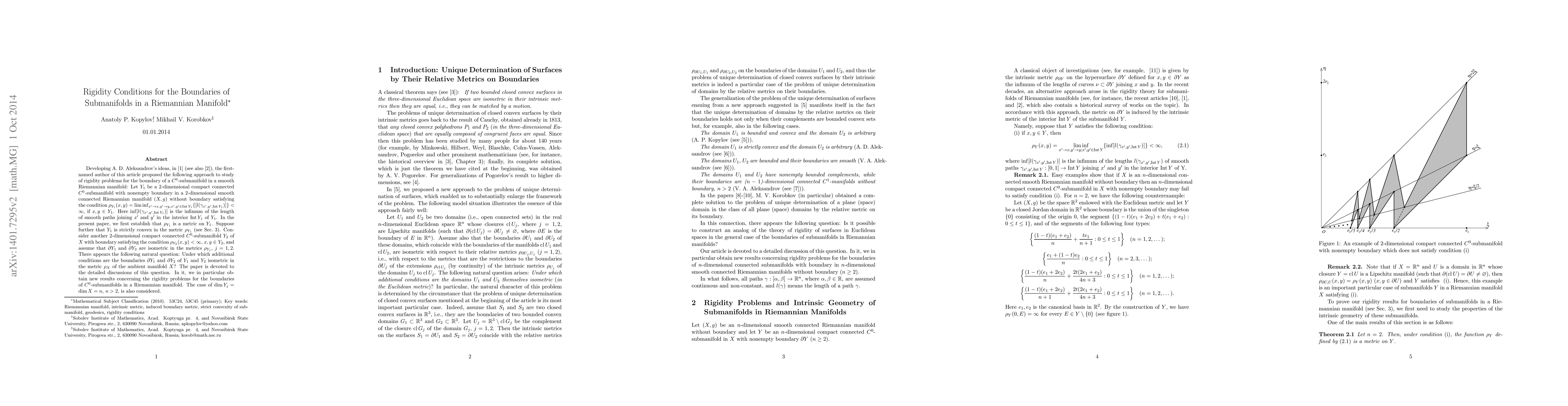 Developing A.D. Aleksandrov's ideas, the first-named author of this article proposed the following approach to study of rigidity problems for the boundary of a $C^0$-submanifold in a smooth Riemannian manifold: Let $Y_1$ be a 2-dimensional compact connected $C^0$-submanifold with nonempty boundary in a 2-dimensional smooth connected Riemannian manifold $(X,g)$ without boundary satisfying the condition $$\rho_{Y_1}(x,y) = \liminf_{x' \to x, y' \to y, x',y' \in \mathop{\rm Int} Y_1} \{[l(\gamma_{x',y',\mathop{\rm Int} Y_1})]\} < \infty,$$ if $x,y \in Y_1$. Here $\inf[l(\gamma_{x',y',\mathop{\rm Int} Y_1})]$ is the infimum of the length of smooth paths joining $x'$ and $y'$ in the interior $\mathop{\rm Int} Y_1$ of $Y_1$. In the present paper, we first establish that $\rho_{Y_1}$ is a metric on $Y_1$. Suppose further that $Y_1$ is strictly convex in the metric $\rho_{Y_1}$. Consider another 2-dimensional compact connected $C^0$-submanifold $Y_2$ of $X$ with boundary satisfying the condition $\rho_{Y_2}(x,y) < \infty$, $x,y \in Y_2$, and assume that $\partial Y_1$ and $\partial Y_2$ are isometric in the metrics $\rho_{Y_j}$, $j = 1,2$. There appears the following natural question: Under which additional conditions are the boundaries $\partial Y_1$ and $\partial Y_2$ of $Y_1$ and $Y_2$ isometric in the metric $\rho_X$ of the ambient manifold $X$? The paper is devoted to the detailed discussions of this question. In it, we in particular obtain a number of new results concerning the rigidity problems for the boundaries of $C^0$-submanifolds in a Riemannian manifold. The case of $\dim Y_j = \dim X = n$, $n > 2$, is also considered.