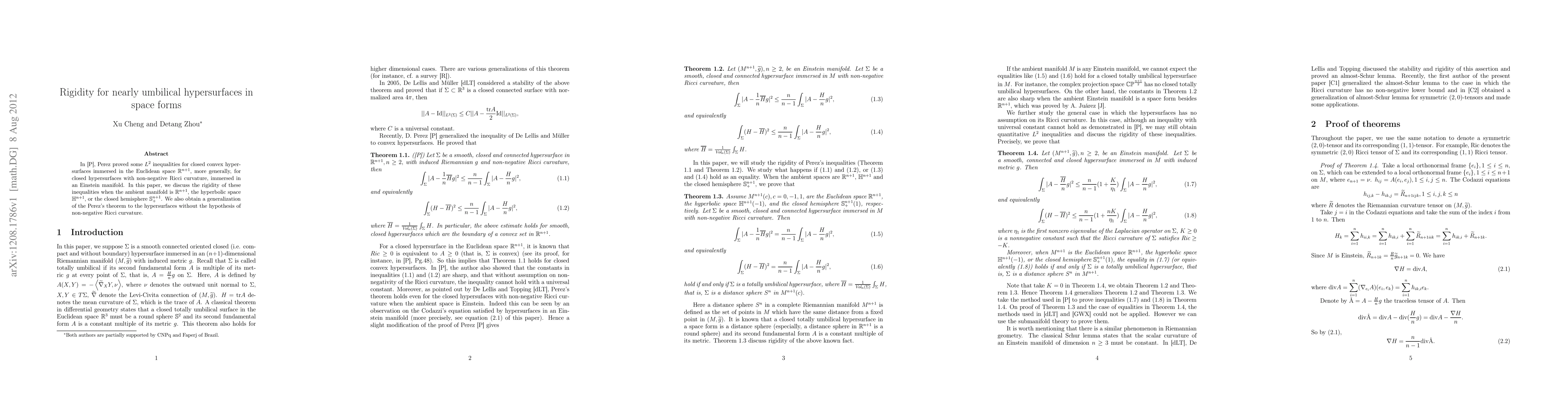 Perez proved some $L^2$ inequalities for closed convex hypersurfaces immersed in the Euclidean space $\mathbb{R}^{n+1}$, more generally, for closed hypersurfaces with non-negative Ricci curvature, immersed in an Einstein manifold. In this paper, we discuss the rigidity of these inequalities when the ambient manifold is $\mathbb{R}^{n+1}$, the hyperbolic space $\mathbb{H}^{n+1}$, or the closed hemisphere $\mathbb{S}_+^{n+1}$. We also obtain a generalization of the Perez's theorem to the hypersurfaces without the hypothesis of non-negative Ricci curvature.
