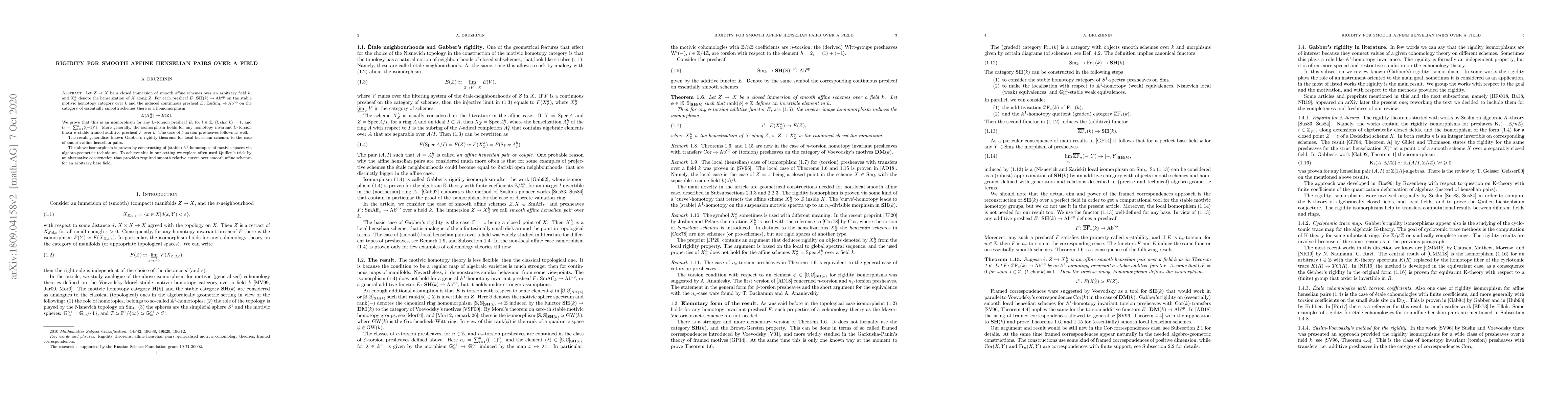 Let $Z\to X$ be a closed immersion of smooth affine schemes over an arbitrary field $k$, and $X^h_Z$ denote the henselization of $X$ along $Z$. For each presheaf $E\colon \mathbf{SH}(k)\to \mathrm{Ab}^\mathrm{op}$ on the stable motivic homotopy category over $k$ and the induced continuous presheaf $E\colon \mathrm{EssSm}_k\to \mathrm{Ab}^\mathrm{op}$ on the category of essentially smooth schemes there is a homomorphism \[E(X^h_Z)\to E(Z).\] We prove that this is an isomorphism for any $l_\varepsilon$-torsion presheaf $E$, for $l\in \mathbb Z$, $(l,\mathrm{chark}\,k)=1$, and $l_\varepsilon=\sum_{i=1}^n \langle (-1)^i \rangle$. More generally, the isomorphism holds for any homotopy invariant $l_\varepsilon$-torsion linear $\sigma$-stable framed additive presheaf $F$ over $k$. The case of $l$-torsion presheaves follows as well. The result generalises known Gabber's rigidity theorems for local henselian schemes to the case of smooth affine henselian pairs. The above isomorphism is proven by constructing of (stable) $\mathbb{A}^1$-homotopies of motivic spaces via algebro-geometric techniques. To achieve this in our setting we replace often used Quillen's trick by an alternative construction that provides required smooth relative curves over smooth affine schemes for an arbitrary base field.