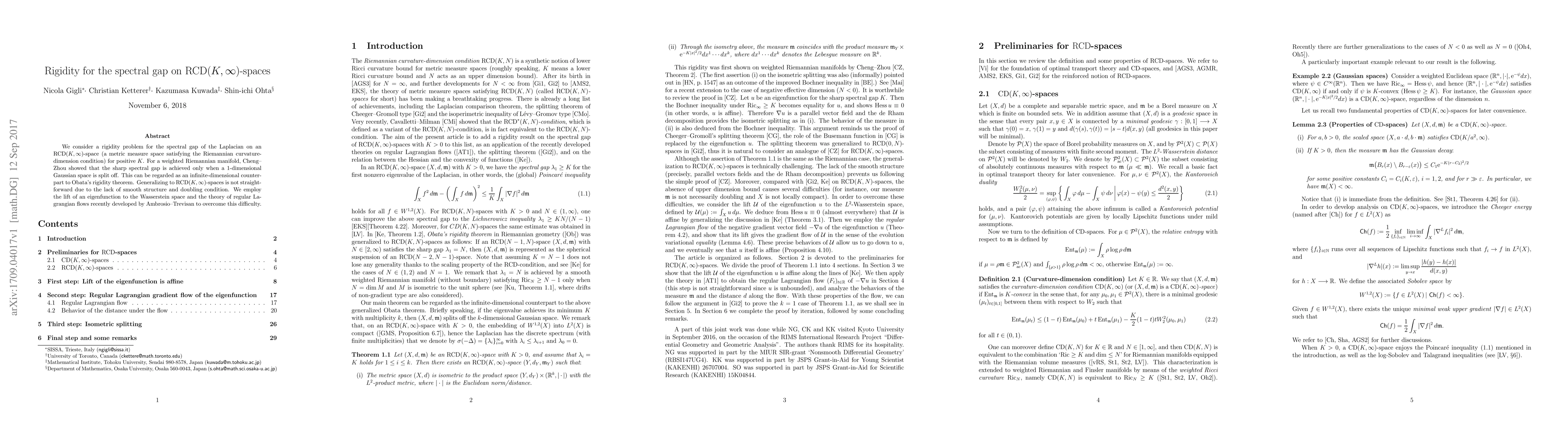 This paper investigates the rigidity of the spectral gap for the Laplacian on $RCD(K,\infty)$-spaces, extending Cheng--Zhou's result for weighted Riemannian manifolds to infinite-dimensional metric measure spaces. The authors utilize the lift of eigenfunctions and the theory of regular Lagrangian flows to address the complexities arising from the lack of smooth structure.