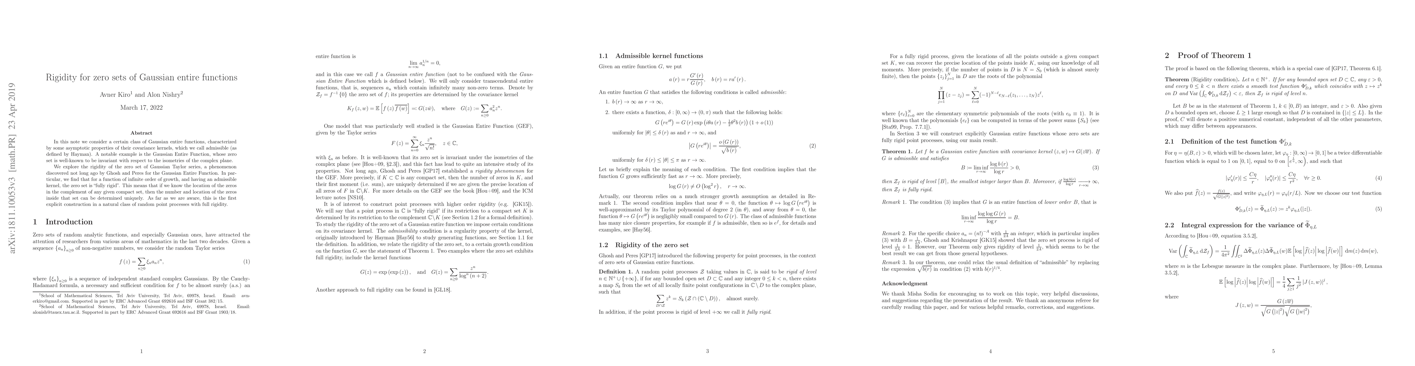 This paper investigates the rigidity properties of zero sets for a class of Gaussian entire functions, specifically those with admissible covariance kernels. It demonstrates that for functions of infinite order with such kernels, the zero set exhibits full rigidity, meaning the internal zeros can be uniquely determined if the zeros outside any compact set are known.