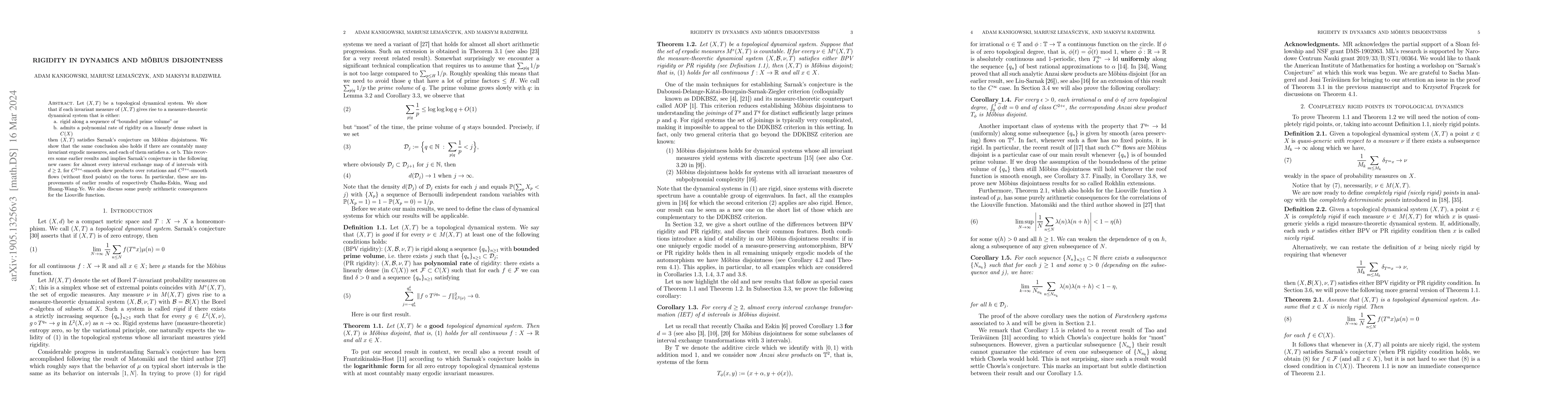 Let $(X, T)$ be a topological dynamical system. We show that if each invariant measure of $(X, T)$ gives rise to a measure-theoretic dynamical system that is either: a. rigid along a sequence of "bounded prime volume" or b. admits a polynomial rate of rigidity on a linearly dense subset in $C(X)$, then $(X, T)$ satisfies Sarnak's conjecture on M\"obius disjointness. We show that the same conclusion also holds if there are countably many invariant ergodic measures, and each of them satisfies a. or b. This recovers some earlier results and implies Sarnak's conjecture in the following new cases: for almost every interval exchange map of $d$ intervals with $d \geq 2$, for $C^{2+\epsilon}$-smooth skew products over rotations and $C^{2+\epsilon}$-smooth flows (without fixed points) on the torus. In particular, these are improvements of earlier results of respectively Chaika-Eskin, Wang and Huang-Wang-Ye. We also discuss some purely arithmetic consequences for the Liouville function.