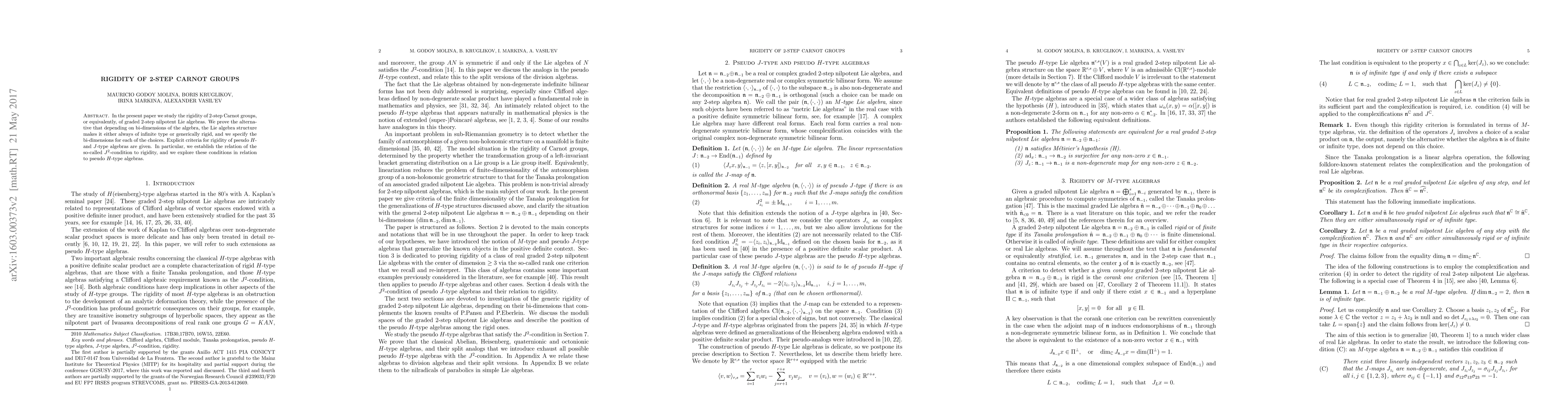 In the present paper we study the rigidity of 2-step Carnot groups, or equivalently, of graded 2-step nilpotent Lie algebras. We prove the alternative that depending on bi-dimensions of the algebra, the Lie algebra structure makes it either always of infinite type or generically rigid, and we specify the bi-dimensions for each of the choices. Explicit criteria for rigidity of pseudo $H$- and $J$-type algebras are given. In particular, we establish the relation of the so-called $J^2$-condition to rigidity, and we explore these conditions in relation to pseudo $H$-type algebras.