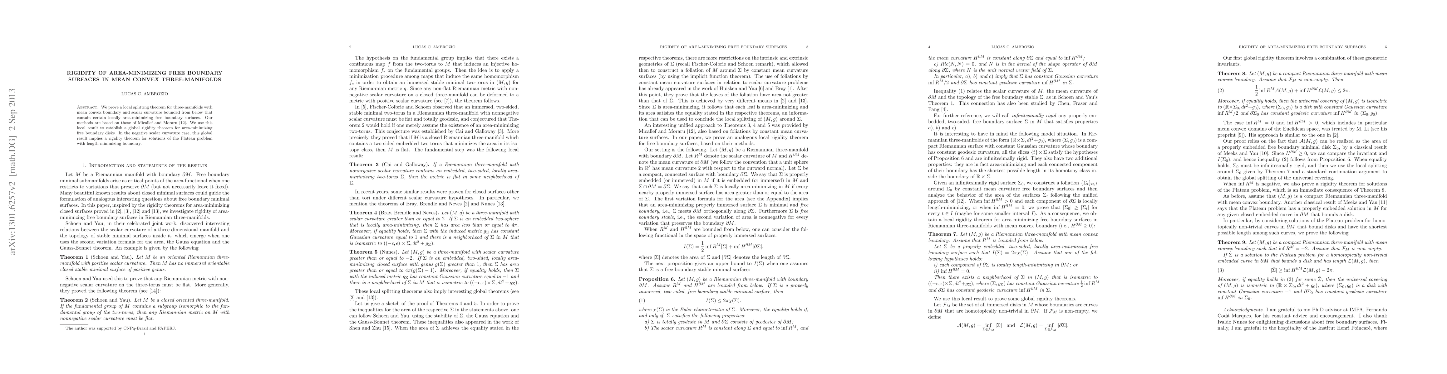 This paper proves a local splitting theorem for mean convex three-manifolds with bounded scalar curvature, establishing the rigidity of area-minimizing free boundary surfaces. The global rigidity theorem for area-minimizing free boundary disks follows, with implications for the Plateau problem in negative scalar curvature cases.
