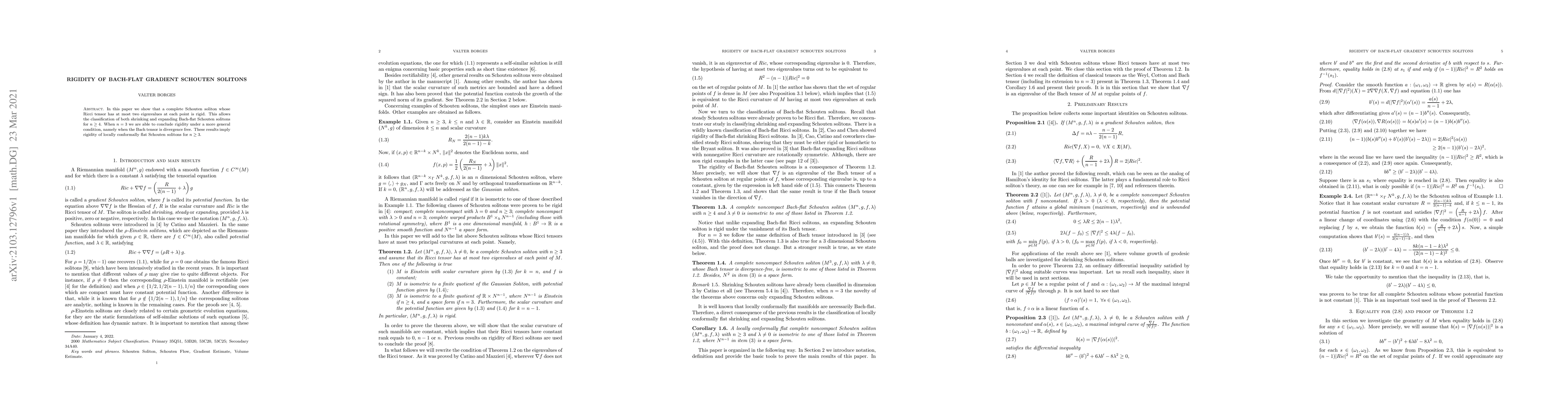 In this paper we show that a complete Schouten soliton whose Ricci tensor has at most two eigenvalues at each point is rigid. This allows the classification of both shrinking and expanding Bach-flat Schouten solitons for $n\geq$ 4. When $n=3$ we are able to conclude rigidity under a more general condition, namely when the Bach tensor is divergence free. These results imply rigidity of locally conformally flat Schouten solitons for $n\geq3$.