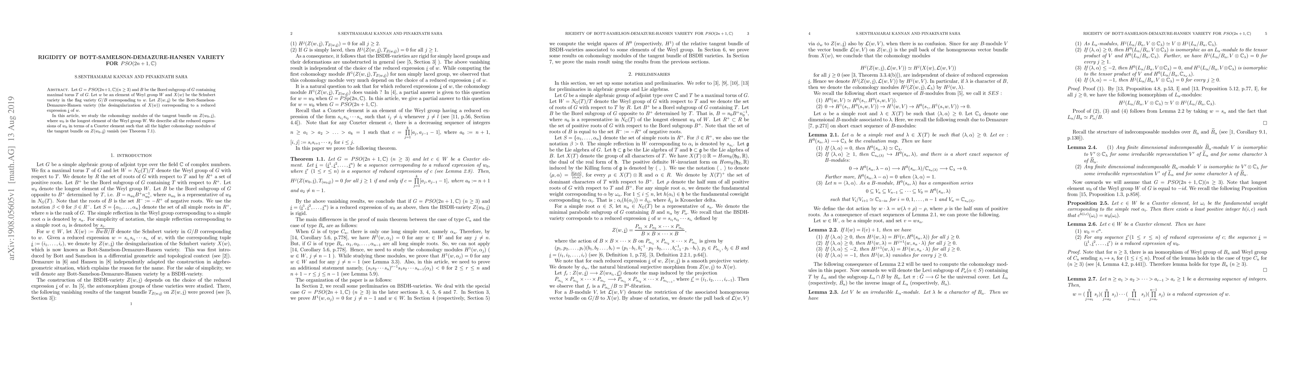 Let $G=PSO(2n+1, \mathbb{C}) (n \ge 3)$ and $B$ be the Borel subgroup of $G$ containing maximal torus $T$ of $G.$ Let $w$ be an element of Weyl group $W$ and $X(w)$ be the Schubert variety in the flag variety $G/B$ corresponding to $w.$ Let $Z(w, \underline{i})$ be the Bott-Samelson-Demazure-Hansen variety (the desingularization of $X(w)$) corresponding to a reduced expression $\underline{i}$ of $w.$ In this article, we study the cohomology modules of the tangent bundle on $Z(w_{0}, \underline{i}),$ where $w_{0}$ is the longest element of the Weyl group $W.$ We describe all the reduced expressions of $w_{0}$ in terms of a Coxeter element such that all the higher cohomology modules of the tangent bundle on $Z(w_{0}, \underline{i})$ vanish (see Theorem \ref{theorem 8.1}).