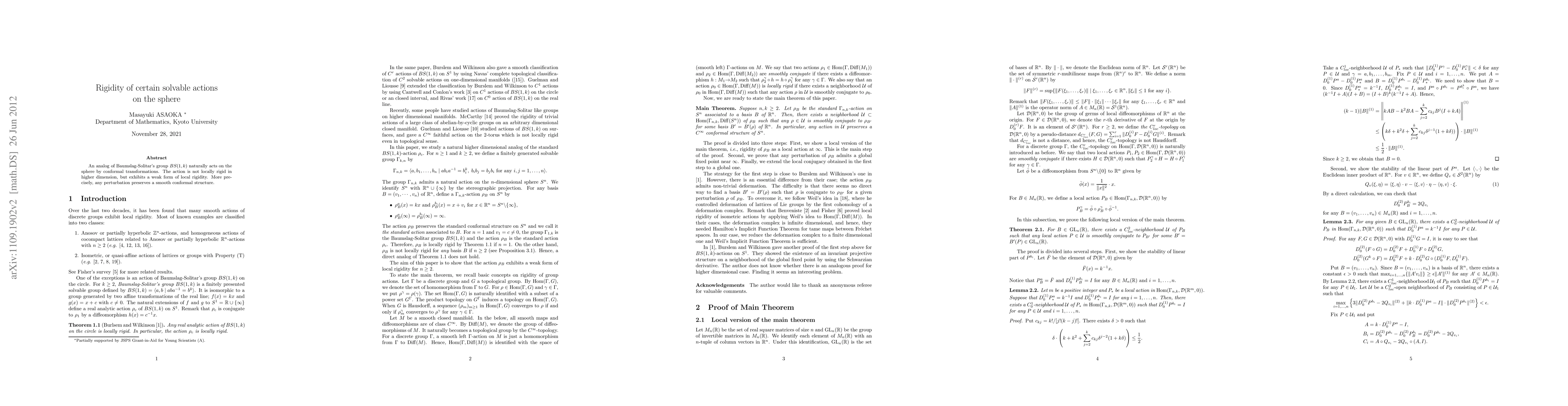 Researchers found that certain solvable actions on a sphere exhibit weak local rigidity under perturbations, preserving smooth conformal structures.