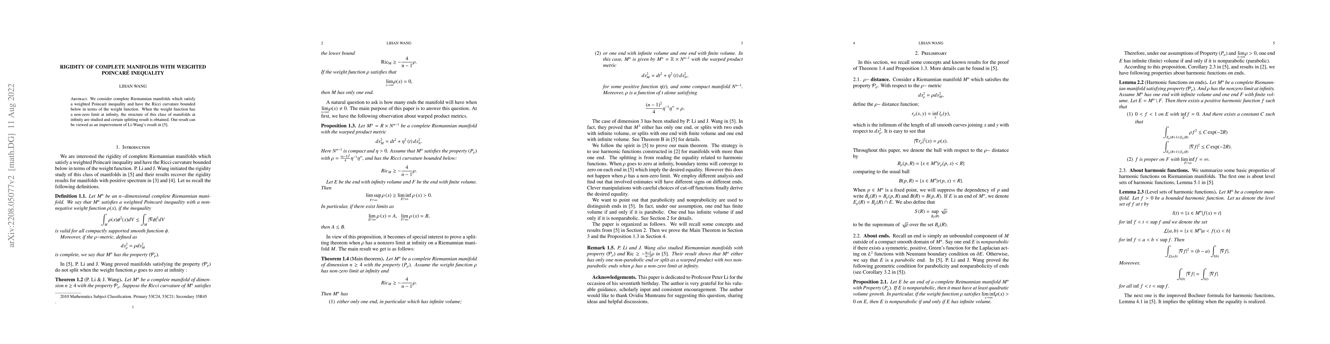 This paper investigates complete Riemannian manifolds with a weighted Poincaré inequality and a bounded Ricci curvature, showing a splitting result when the weight function approaches a non-zero limit at infinity, thus improving upon Li-Wang's prior findings.