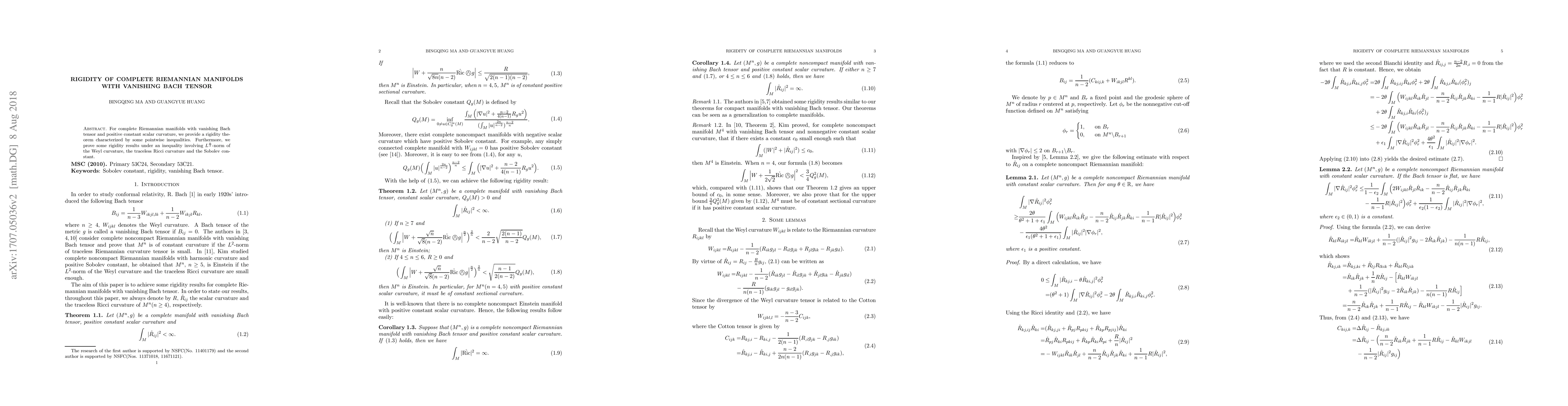 This paper establishes a rigidity theorem for complete Riemannian manifolds with a vanishing Bach tensor and positive constant scalar curvature, characterized by specific pointwise inequalities. Additionally, it presents further rigidity results contingent on an inequality involving the $L^{\frac{n}{2}}$-norm of the Weyl curvature, traceless Ricci curvature, and the Sobolev constant.