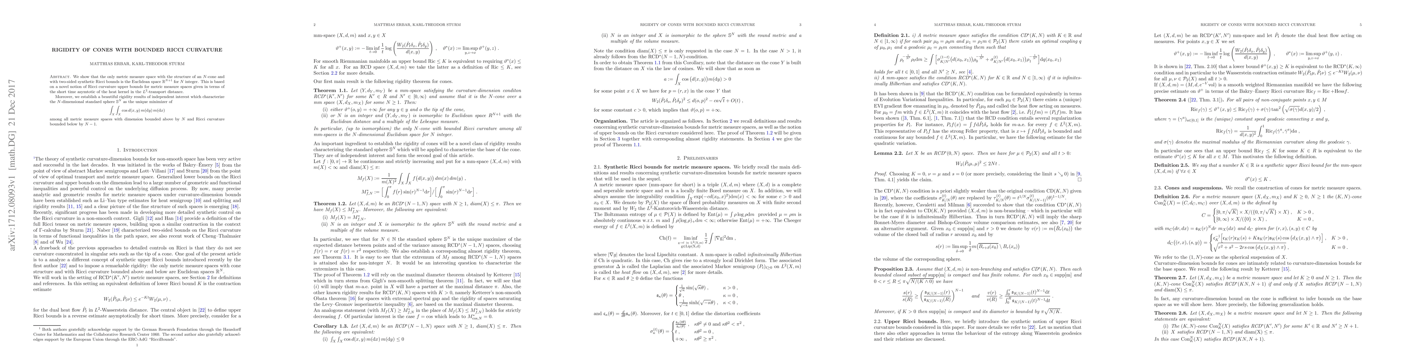 The paper demonstrates that Euclidean space ${\mathbb R}^{N+1}$ is the only $N$-cone with two-sided synthetic Ricci bounds, proving rigidity based on a new heat kernel-derived notion of Ricci curvature. Additionally, it establishes the $N$-dimensional standard sphere ${\mathbb S}^N$ as the unique minimizer of a specific integral involving cosine of distances in spaces with Ricci curvature bounded below by $N-1$.