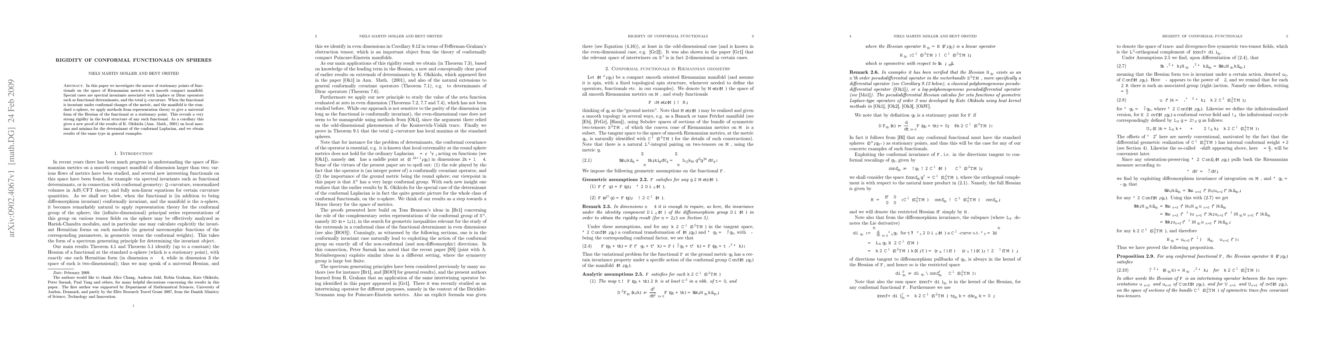 In this paper we investigate the nature of stationary points of functionals on the space of Riemannian metrics on a smooth compact manifold. Special cases are spectral invariants associated with Laplace or Dirac operators such as functional determinants, and the total Q-curvature. When the functional is invariant under conformal changes of the metric, and the manifold is the standard n-sphere, we apply methods from representation theory to give a universal form of the Hessian of the functional at a stationary point. This reveals a very strong rigidity in the local structure of any such functional. As a corollary this gives a new proof of the results of K. Okikiolu (Ann. Math., 2001) on local maxima and minima for the determinant of the conformal Laplacian, and we obtain results of the same type in general examples.