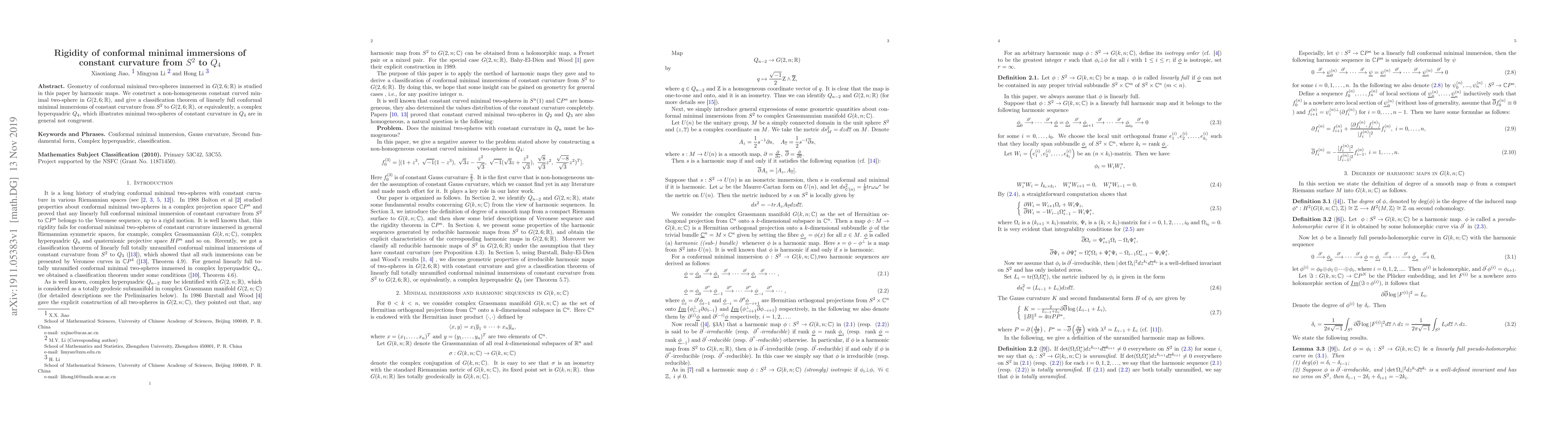 Geometry of conformal minimal two-spheres immersed in $G(2,6;\mathbb{R})$ is studied in this paper by harmonic maps. We construct a non-homogeneous constant curved minimal two-sphere in $G(2,6;\mathbb{R})$, and give a classification theorem of linearly full conformal minimal immersions of constant curvature from $S^2$ to $G(2,6;\mathbb{R})$, or equivalently, a complex hyperquadric $Q_{4}$, which illustrates minimal two-spheres of constant curvature in $Q_{4}$ are in general not congruent.
