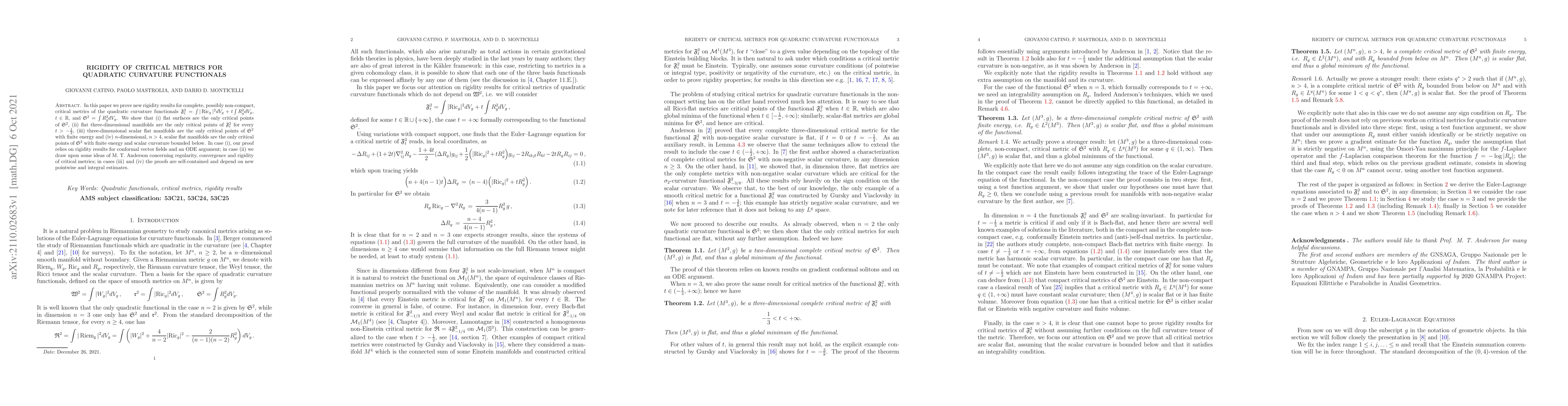 This research establishes rigidity results for critical metrics of quadratic curvature functionals in various dimensions, proving that flat surfaces are the only critical points for $mathfrak{S}^2$, flat three-dimensional manifolds for $mathfrak{F}^{2}_t$ (with $t > -rac{1}{3}$), and scalar flat manifolds (for $n > 4$) with finite energy and bounded scalar curvature are the only critical points for $mathfrak{S}^2$. The proofs involve conformal vector field rigidity, new ODE arguments, and integral/pointwise estimates.