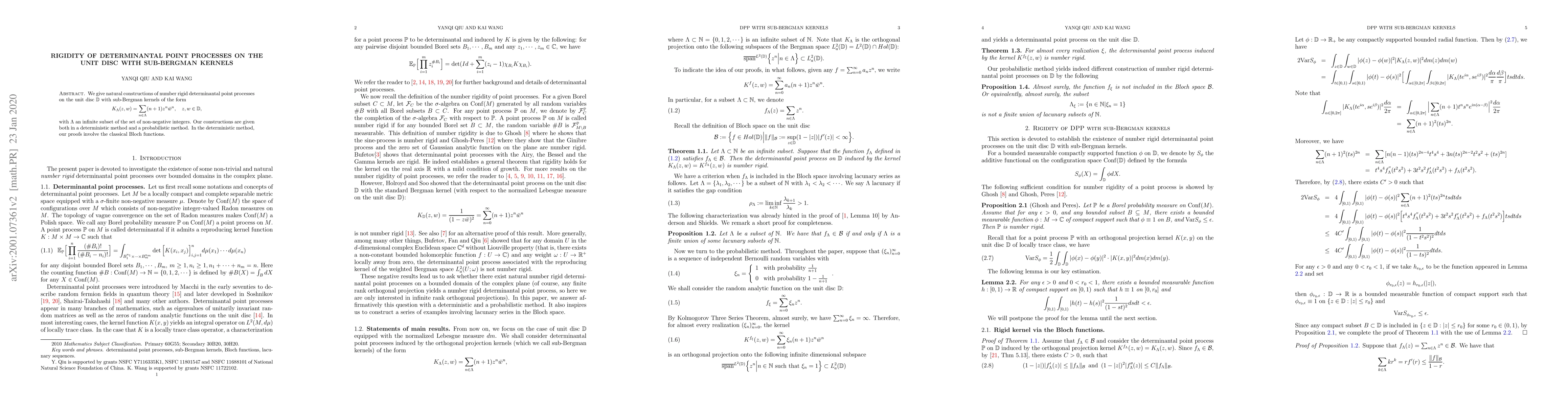 Two-line summary: This paper presents deterministic and probabilistic constructions of rigid determinantal point processes on the unit disc using sub-Bergman kernels of a specific form. The deterministic method leverages classical Bloch functions to provide proofs for these constructions, establishing their rigidity properties.