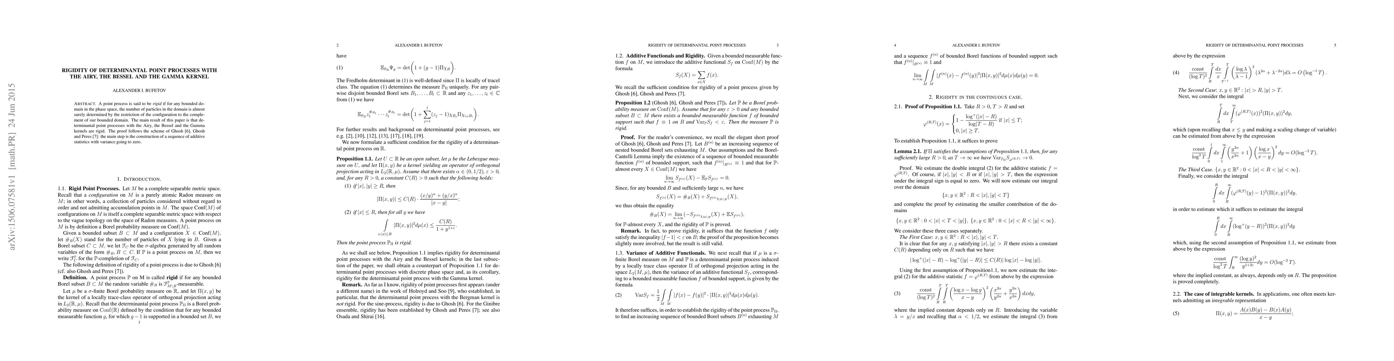 This paper demonstrates that determinantal point processes with the Airy, Bessel, and Gamma kernels are rigid, meaning the number of particles in any bounded domain is almost surely determined by the configuration outside that domain. The proof utilizes the method of constructing a sequence of additive statistics with vanishing variance, following the scheme established by Ghosh and Peres.