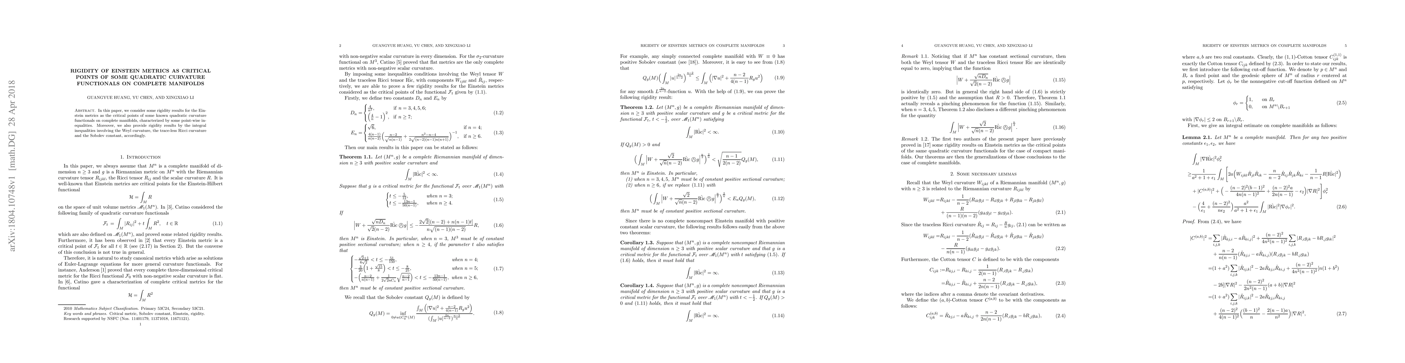 This paper investigates rigidity properties of Einstein metrics on complete manifolds, showing they are critical points of quadratic curvature functionals defined by point-wise inequalities. It also presents additional rigidity results based on integral inequalities involving Weyl curvature, trace-less Ricci curvature, and Sobolev constant.
