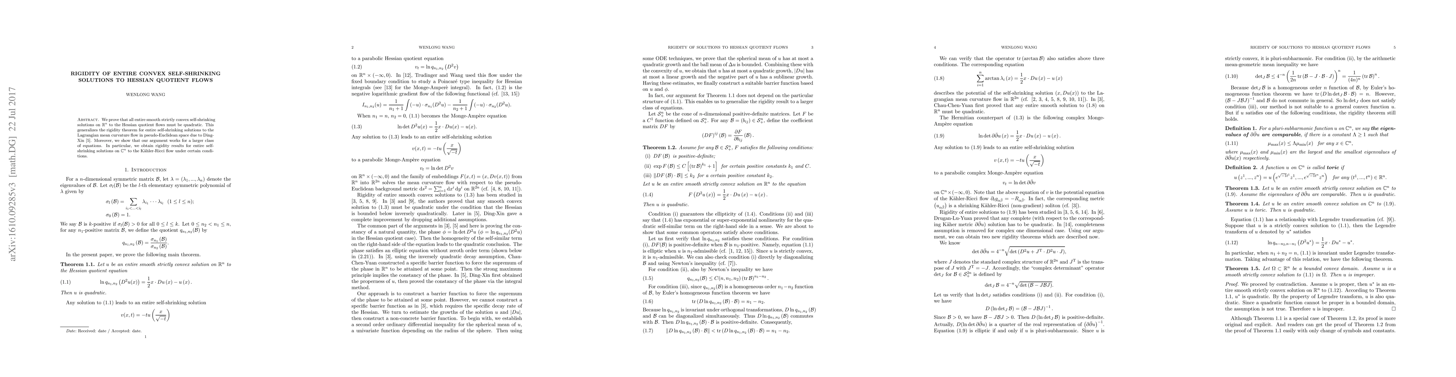 This paper proves that all entire smooth strictly convex self-shrinking solutions to Hessian quotient flows in $\mathbb{R}^n$ are quadratic, extending the rigidity theorem for Lagrangian mean curvature flow. It also demonstrates the applicability of the argument to Kähler-Ricci flows in $\mathbb{C}^n$ under specific conditions.