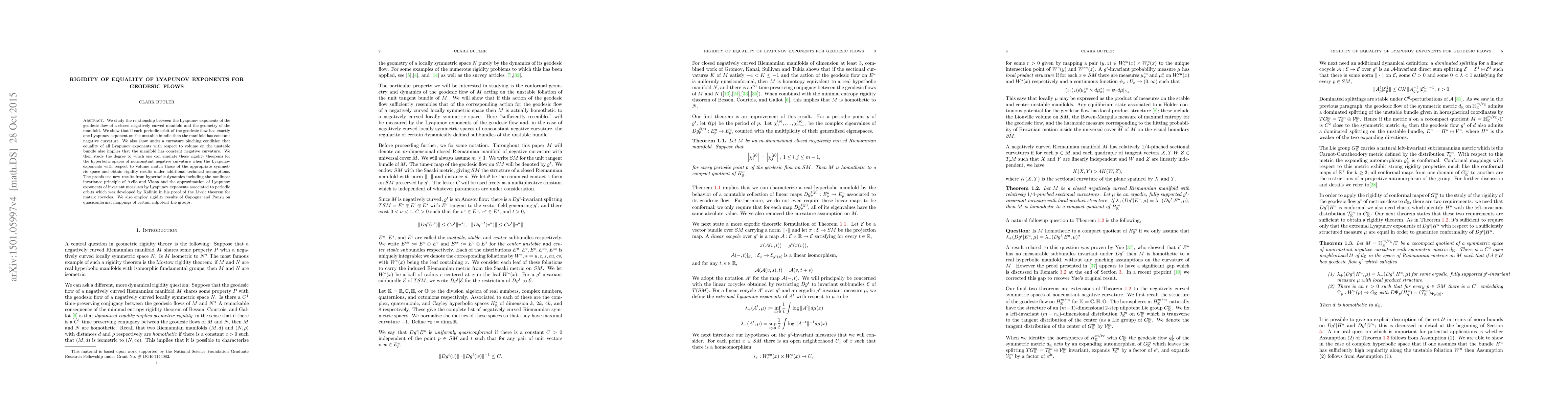 We study the relationship between the Lyapunov exponents of the geodesic flow of a closed negatively curved manifold and the geometry of the manifold. We show that if each periodic orbit of the geodesic flow has exactly one Lyapunov exponent on the unstable bundle then the manifold has constant negative curvature. We also show under a curvature pinching condition that equality of all Lyapunov exponents with respect to volume on the unstable bundle also implies that the manifold has constant negative curvature. We then study the degree to which one can emulate these rigidity theorems for the hyperbolic spaces of nonconstant negative curvature when the Lyapunov exponents with respect to volume match those of the appropriate symmetric space and obtain rigidity results under additional technical assumptions. The proofs use new results from hyperbolic dynamics including the nonlinear invariance principle of Avila and Viana and the approximation of Lyapunov exponents of invariant measures by Lyapunov exponents associated to periodic orbits which was developed by Kalinin in his proof of the Livsic theorem for matrix cocycles. We also employ rigidity results of Capogna and Pansu on quasiconformal mappings of certain nilpotent Lie groups.