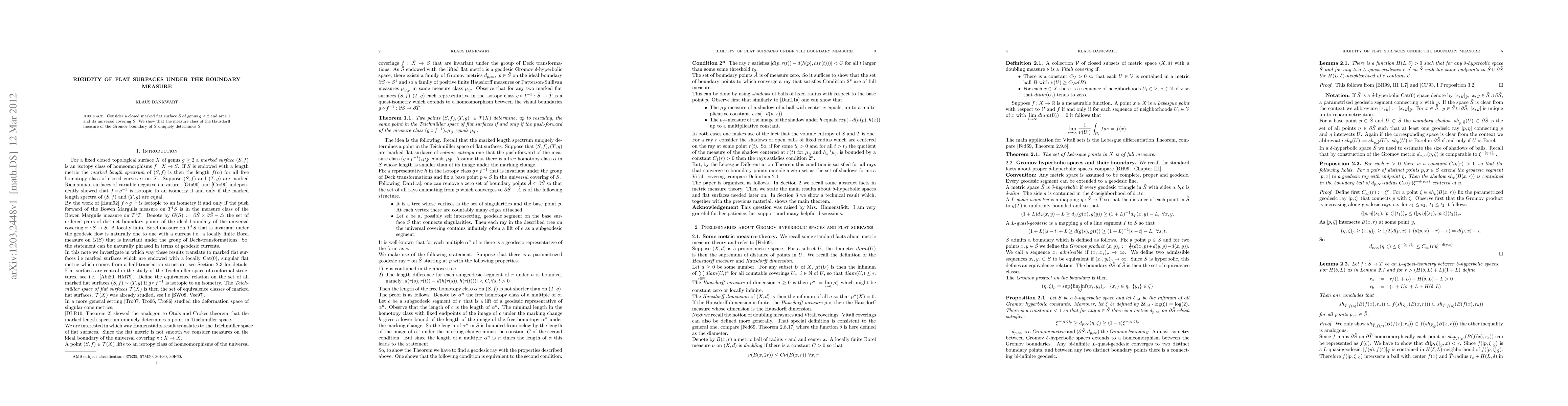 Consider a closed marked flat surface $S$ of genus $g\geq 2$ and area 1 and its universal covering $\tilde{S}$. We show that the measure class of the Hausdorff measure of the Gromov boundary of $\tilde{S}$ uniquely determines $S$.
