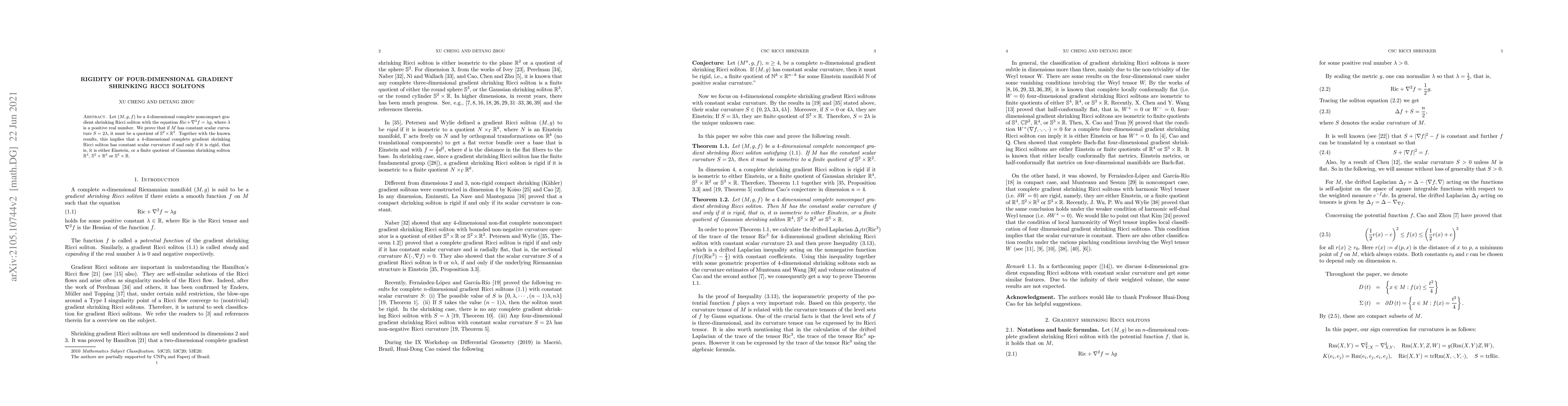 Let $(M, g, f)$ be a $4$-dimensional complete noncompact gradient shrinking Ricci soliton with the equation $Ric+\nabla^2f=\lambda g$, where $\lambda$ is a positive real number. We prove that if $M$ has constant scalar curvature $S=2\lambda$, it must be a quotient of $\mathbb{S}^2\times \mathbb{R}^2$. Together with the known results, this implies that a $4$-dimensional complete gradient shrinking Ricci soliton has constant scalar curvature if and only if it is rigid, that is, it is either Einstein, or a finite quotient of Gaussian shrinking soliton $\Bbb{R}^4$, $\Bbb{S}^{2}\times\Bbb{R}^{2}$ or $\Bbb{S}^{3}\times\Bbb{R}$.