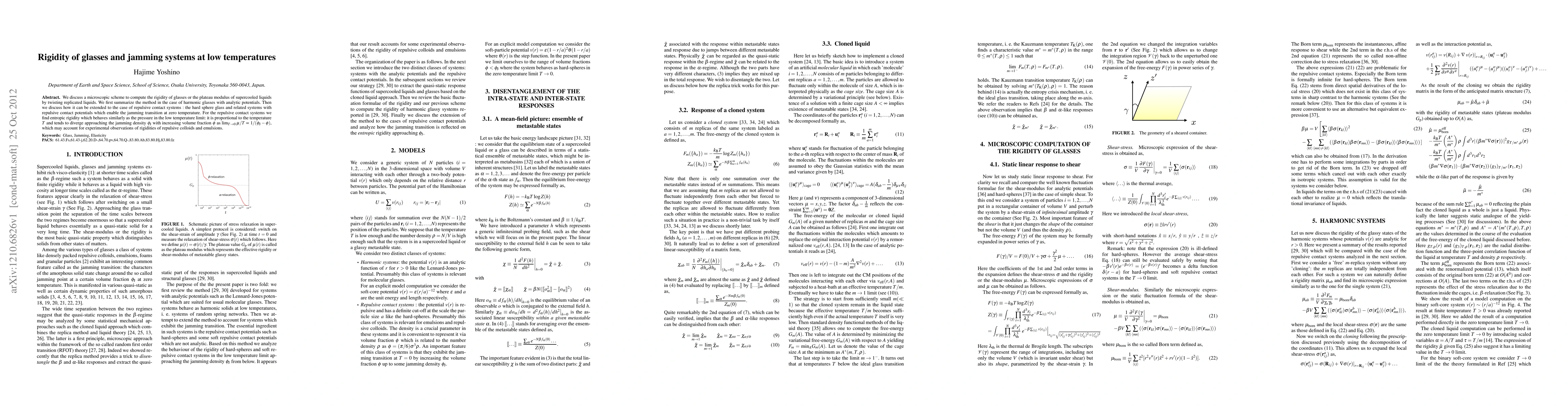 We discuss a microscopic scheme to compute the rigidity of glasses or the plateau modulus of supercooled liquids by twisting replicated liquids. We first summarize the method in the case of harmonic glasses with analytic potentials. Then we discuss how it can be extended to the case of repulsive contact systems : the hard sphere glass and related systems with repulsive contact potentials which enable the jamming transition at zero temperature. For the repulsive contact systems we find entropic rigidity which behaves similarly as the pressure in the low temperature limit: it is proportional to the temperature and tends to diverge approaching the jamming density with increasing volume fraction, which may account for experimental observations of rigidities of repulsive colloids and emulsions.