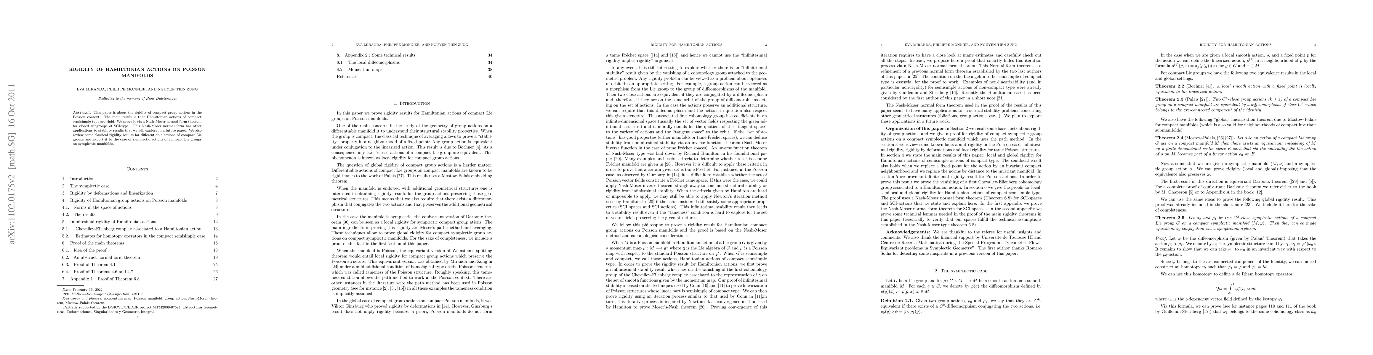 This paper is about the rigidity of compact group actions in the Poisson context. The main resut is that Hamiltonian actions of compact semisimple type are rigid. We prove it via a Nash-Moser normal form theorem for closed subgroups of SCI-type. This Nash-Moser normal form has other applications to stability results that we will explore in a future paper. We also review some classical rigidity results for differentiable actions of compact Lie groups and export it to the case of symplectic actions of compact Lie groups on symplectic manifolds.