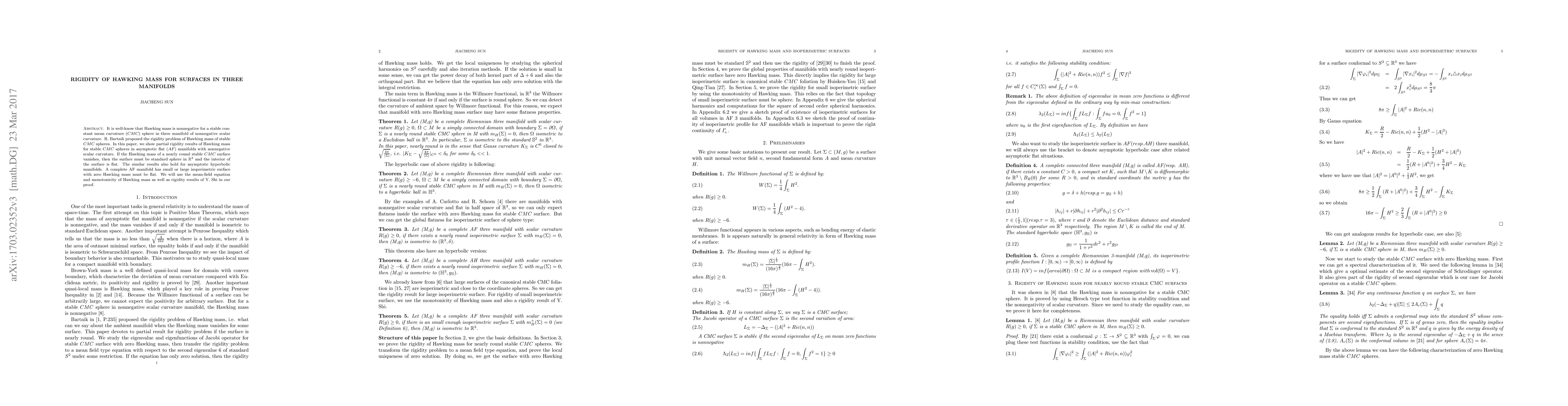 It is well-know that Hawking mass is nonnegative for a stable constant mean curvature ($CMC$) sphere in three manifold of nonnegative scalar curvature. R. Bartnik proposed the rigidity problem of Hawking mass of stable $CMC$ spheres. In this paper, we show partial rigidity results of Hawking mass for stable $CMC$ spheres in asymptotic flat ($AF$) manifolds with nonnegative scalar curvature. If the Hawking mass of a nearly round stable $CMC$ surface vanishes, then the surface must be standard sphere in $\mathbb{R}^3 $ and the interior of the surface is flat. The similar results also hold for asymptotic hyperbolic manifolds. A complete AF manifold has small or large isoperimetric surface with zero Hawking mass must be flat. We will use the mean-field equation and monotonicity of Hawking mass as well as rigidity results of Y. Shi in our proof.