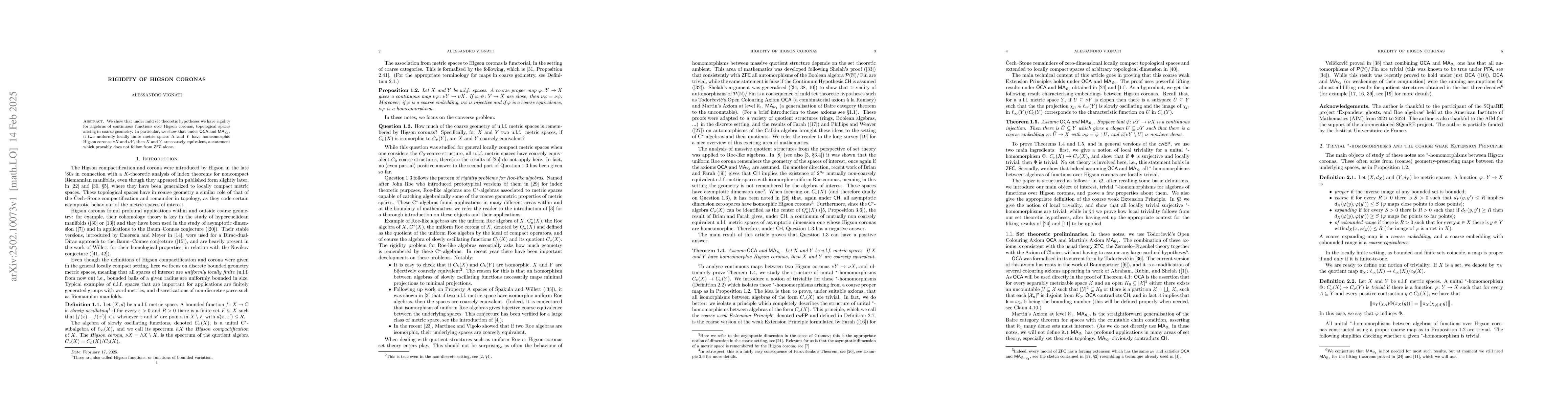 Summary: The paper demonstrates rigidity for algebras of continuous functions over Higson coronas under certain set-theoretic assumptions, proving that homeomorphic Higson coronas imply coarse equivalence between uniformly locally finite metric spaces, a result that cannot be deduced from $\mathsf{ZFC}$ alone.