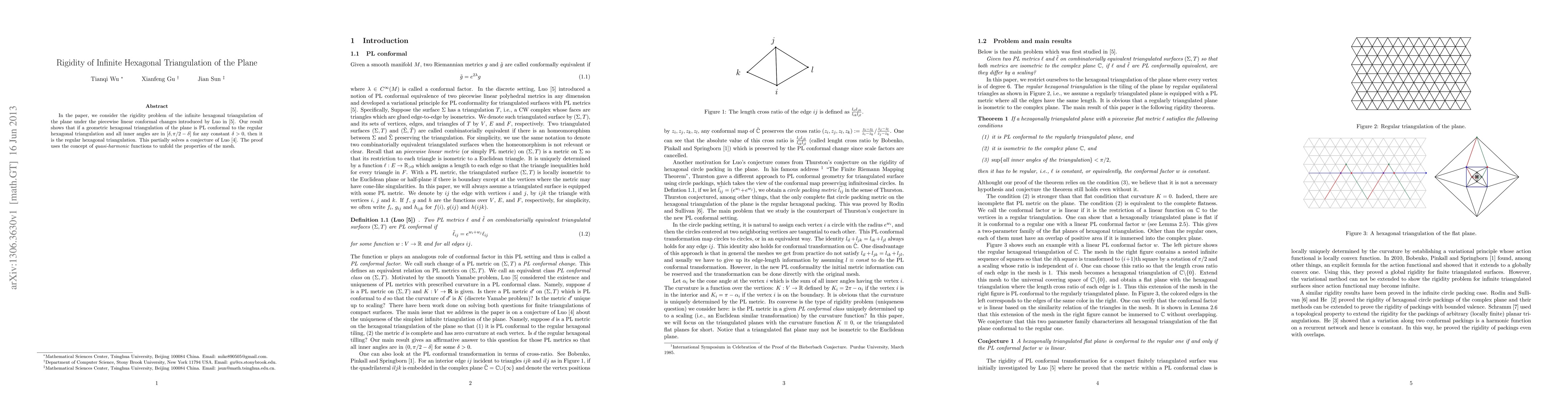 This paper proves the rigidity of infinite hexagonal triangulations of the plane under piecewise linear conformal changes, showing that any such triangulation with angles within a specified range is identical to the regular hexagonal triangulation. The proof leverages quasi-harmonic functions to analyze the mesh properties.