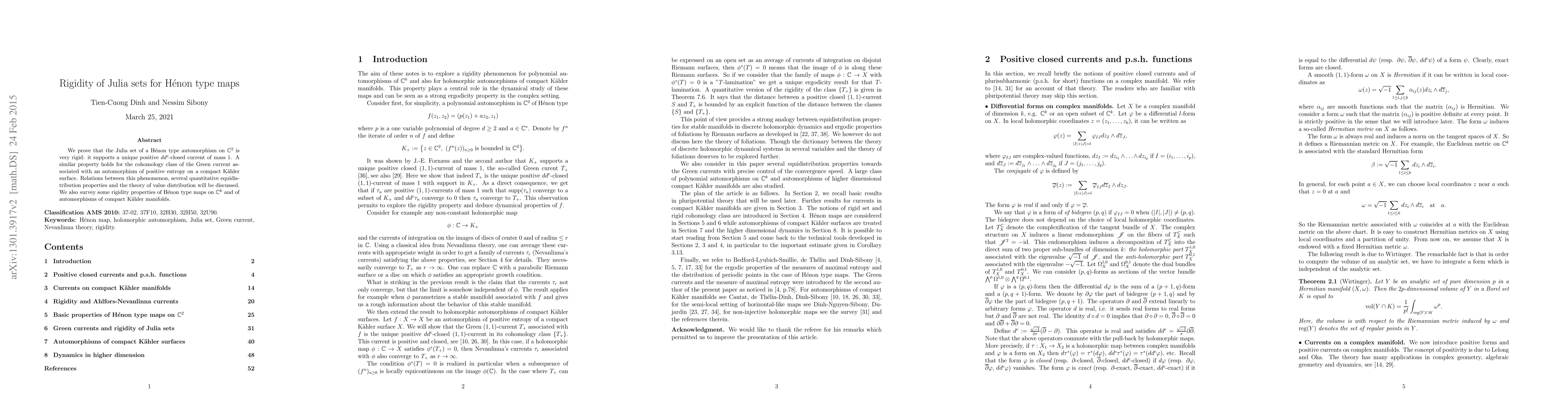 This paper proves the rigidity of Julia sets for Henon type maps, showing they uniquely support a positive ddc-closed current of mass 1. It also discusses similar properties for automorphisms on compact Kaehler surfaces and surveys related quantitative equidistribution and value distribution theories.