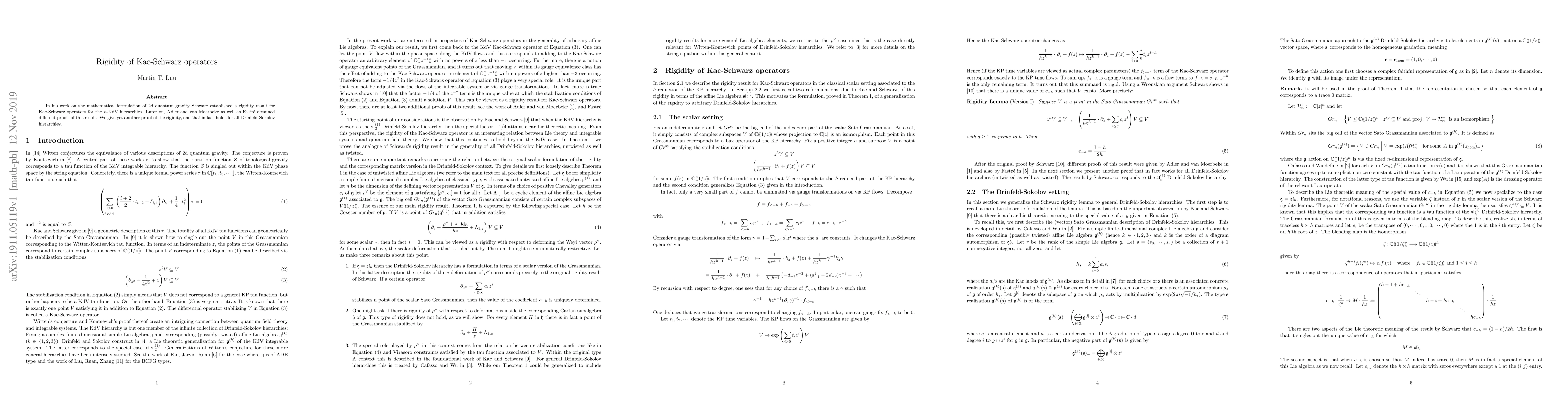 In his work on the mathematical formulation of 2d quantum gravity Schwarz established a rigidity result for Kac-Schwarz operators for the n-KdV hierarchies. Later on, Adler and van Moerbeke as well as Fastr\'{e} obtained different proofs of this result. We give yet another proof of the rigidity, one that in fact holds for all Drinfeld-Sokolov hierarchies.