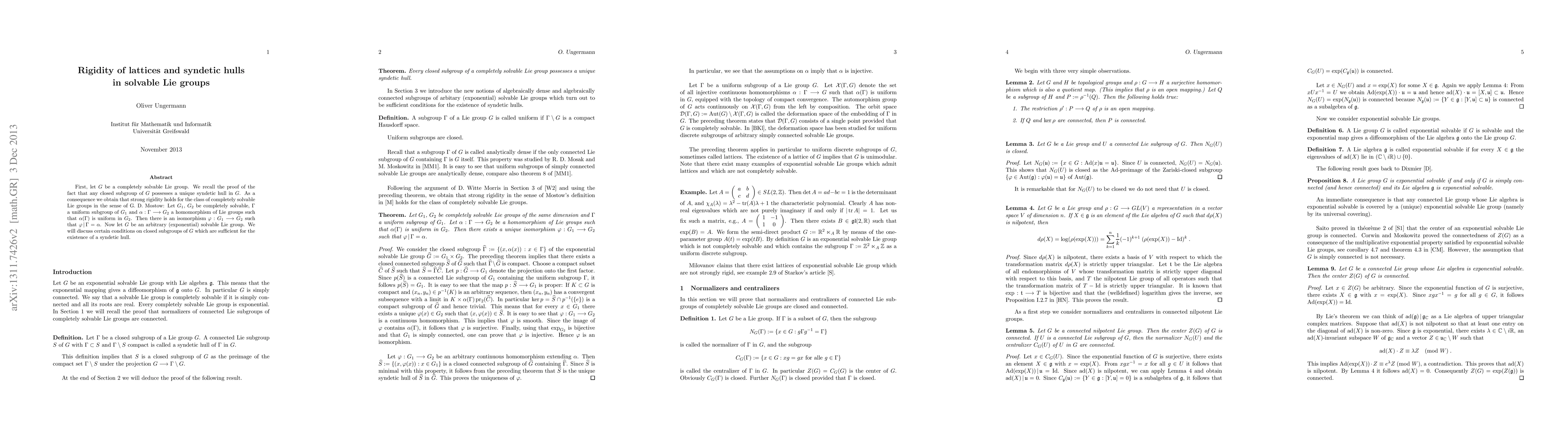 First let $G$ be a completely solvable Lie group. We recall the proof of the following result: Any closed subgroup of $G$ possesses a unique syndetic hull in $G$. As a consequence we conclude that any uniform subgroup $\Gamma$ of $G$ is strongly rigid in the sense of G. D. Mostow: If $\alpha:\Gamma\to G$ is a homomorphism of Lie groups such that $\alpha(\Gamma)$ is uniform in $G$, then there is an automorphism $\varphi$ of $G$ such that $\varphi\,|\,\Gamma=\alpha$. Now let $G$ be an arbitrary (exponential) solvable Lie group. We discuss certain conditions on closed subgroups of $G$ which are sufficient for the existence of a syndetic hull.