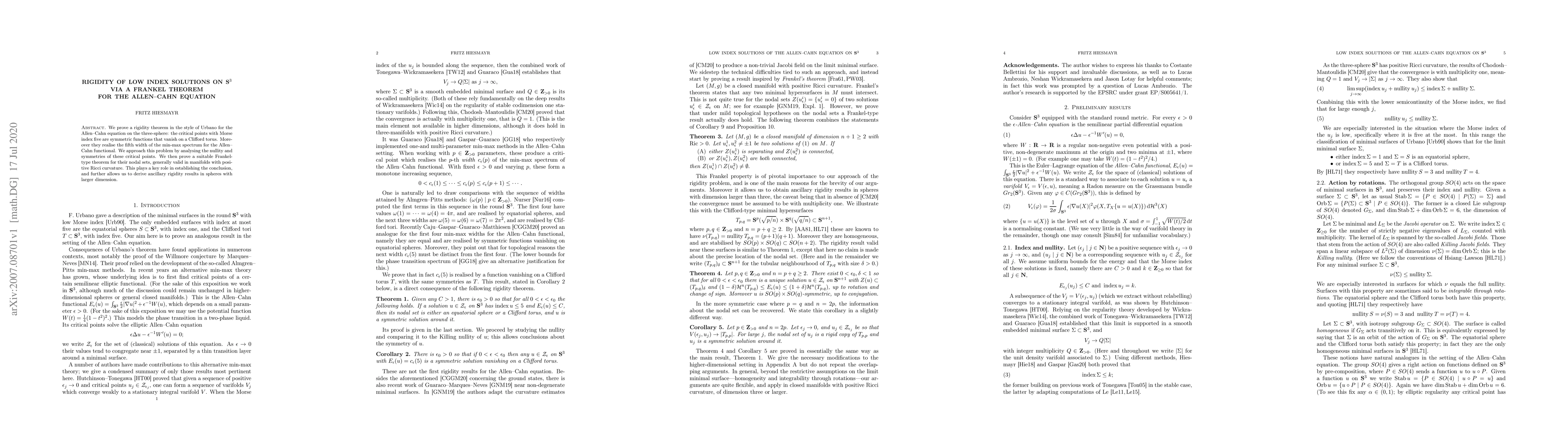 We prove a rigidity theorem in the style of Urbano for the Allen-Cahn equation on the three-sphere: the critical points with Morse index five are symmetric functions that vanish on a Clifford torus. Moreover they realise the fifth width of the min-max spectrum for the Allen-Cahn functional. We approach this problem by analysing the nullity and symmetries of these critical points. We then prove a suitable Frankel-type theorem for their nodal sets, generally valid in manifolds with positive Ricci curvature. This plays a key role in establishing the conclusion, and further allows us to derive ancillary rigidity results in spheres with larger dimension.