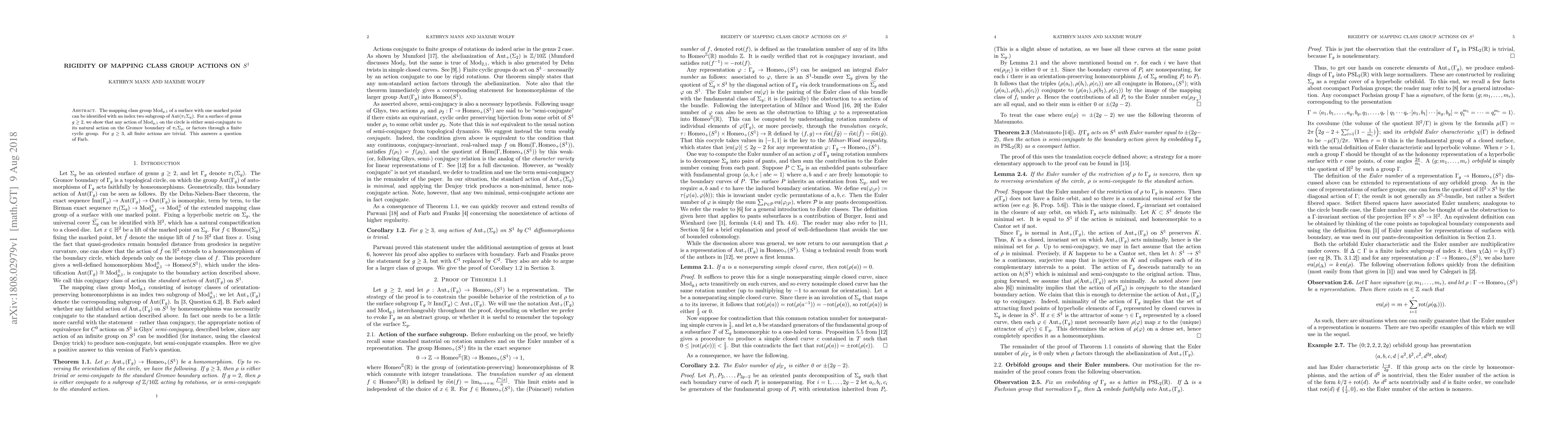The paper proves that actions of the mapping class group $\mathrm{Mod}_{g, 1}$ on $S^1$ either semi-conjugate to its natural action on the Gromov boundary or factor through a finite cyclic group, with all finite actions being trivial for $g \geq 3,$ addressing a question posed by Farb.