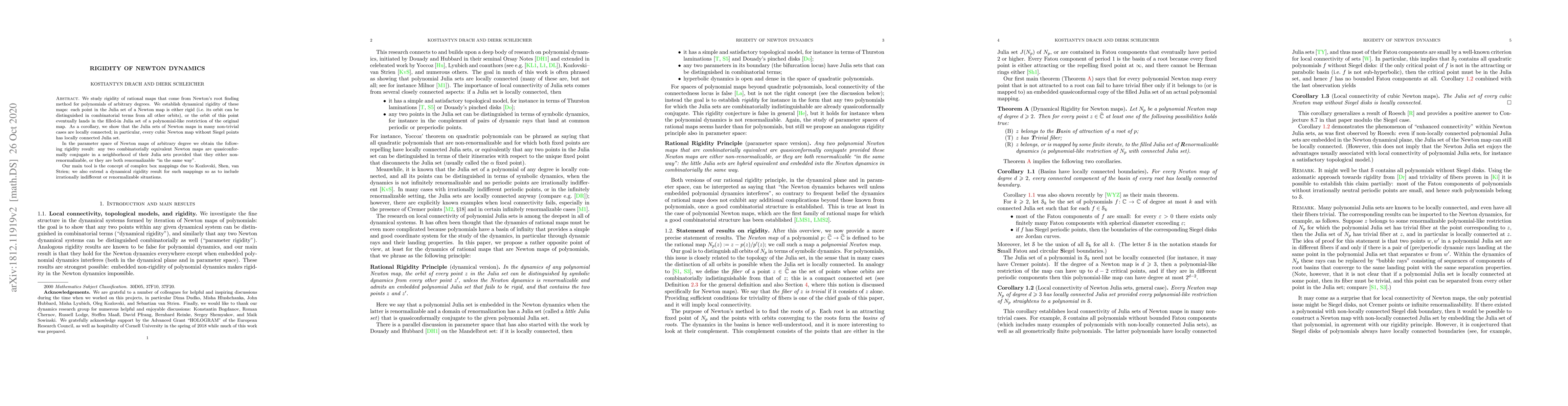This paper explores the dynamical rigidity of Newton maps derived from Newton's method for polynomial root finding, proving that points in the Julia set are either rigid or land in a polynomial-like restriction. It concludes that many cubic Newton maps have locally connected Julia sets and that combinatorially equivalent Newton maps are quasiconformally conjugate in their neighborhoods.