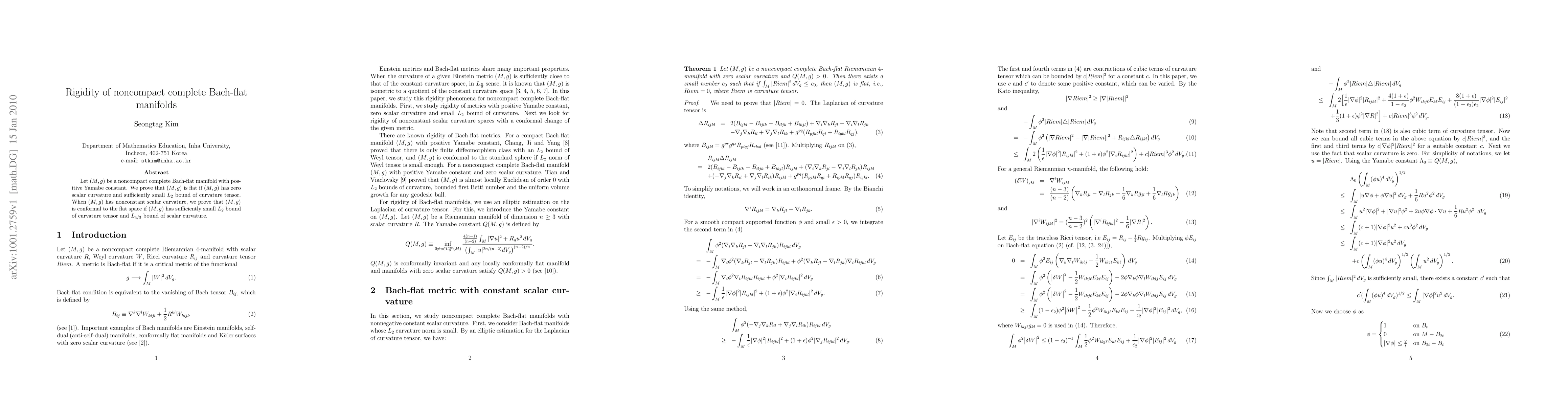 Let $(M,g)$ be a noncompact complete Bach-flat manifold with positive Yamabe constant. We prove that $(M,g)$ is flat if $(M, g)$ has zero scalar curvature and sufficiently small $L_{2}$ bound of curvature tensor. When $(M, g)$ has nonconstant scalar curvature, we prove that $(M, g)$ is conformal to the flat space if $(M, g)$ has sufficiently small $L_2$ bound of curvature tensor and $L_{4/3}$ bound of scalar curvature.