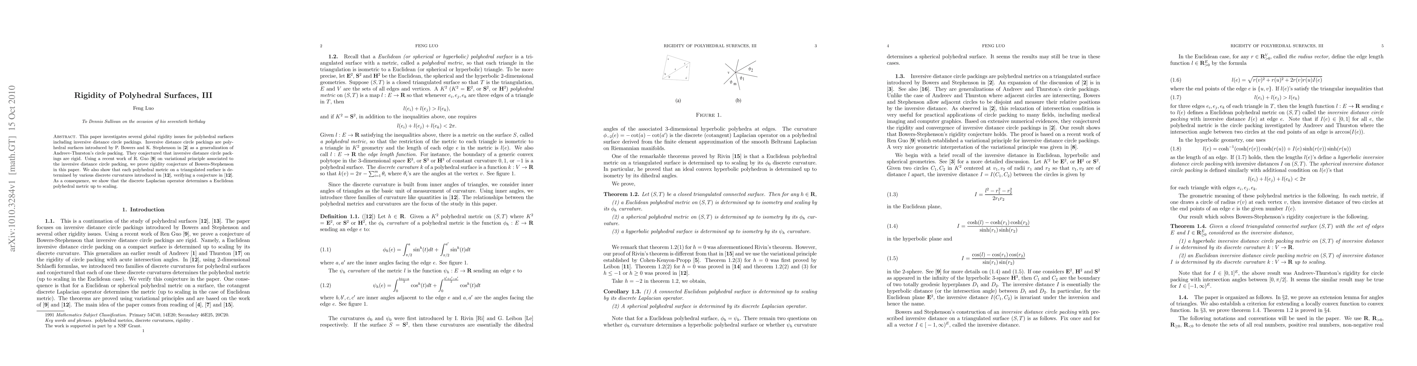 This paper investigates several global rigidity issues for polyhedral surfaces including inversive distance circle packings. Inversive distance circle packings are polyhedral surfaces introduced by P. Bowers and K. Stephenson as a generalization of Andreev-Thurston's circle packing. They conjectured that inversive distance circle packings are rigid. Using a recent work of R. Guo on variational principle associated to the inversive distance circle packing, we prove rigidity conjecture of Bowers-Stephenson in this paper. We also show that each polyhedral metric on a triangulated surface is determined by various discrete curvatures introduced in our previous work, verifying a conjecture in \cite{Lu1}. As a consequence, we show that the discrete Laplacian operator determines a Euclidean polyhedral metric up to scaling.