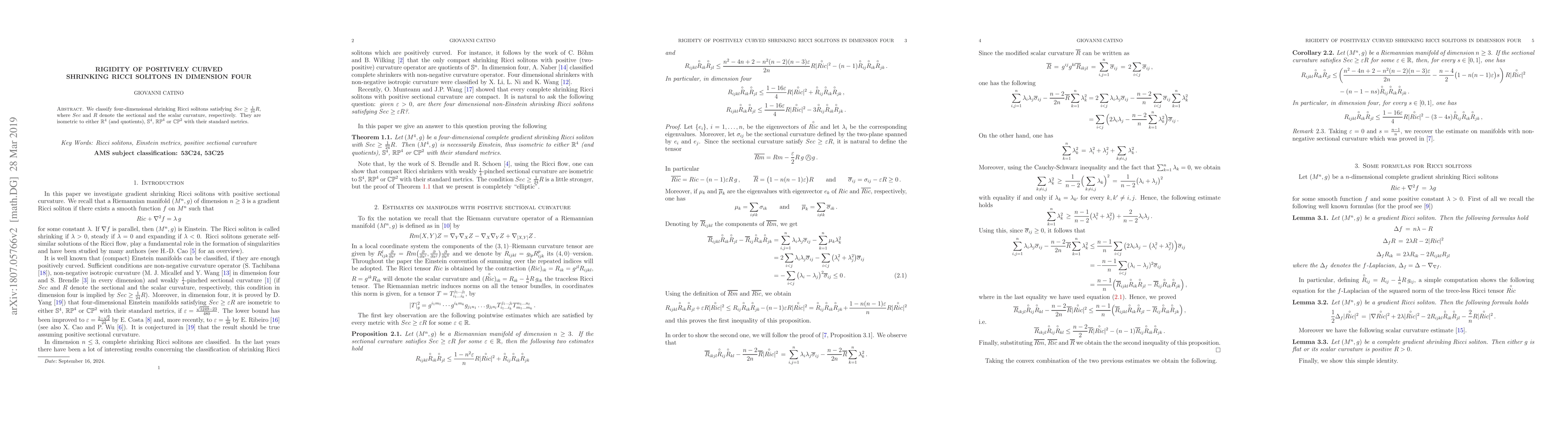 We classify four-dimensional shrinking Ricci solitons satisfying $Sec \geq \frac{1}{24} R$, where $Sec$ and $R$ denote the sectional and the scalar curvature, respectively. They are isometric to either $\mathbb{R}^{4}$ (and quotients), $\mathbb{S}^{4}$, $\mathbb{RP}^{4}$ or $\mathbb{CP}^{2}$ with their standard metrics.